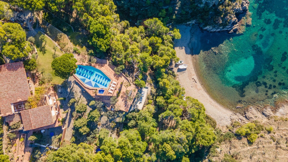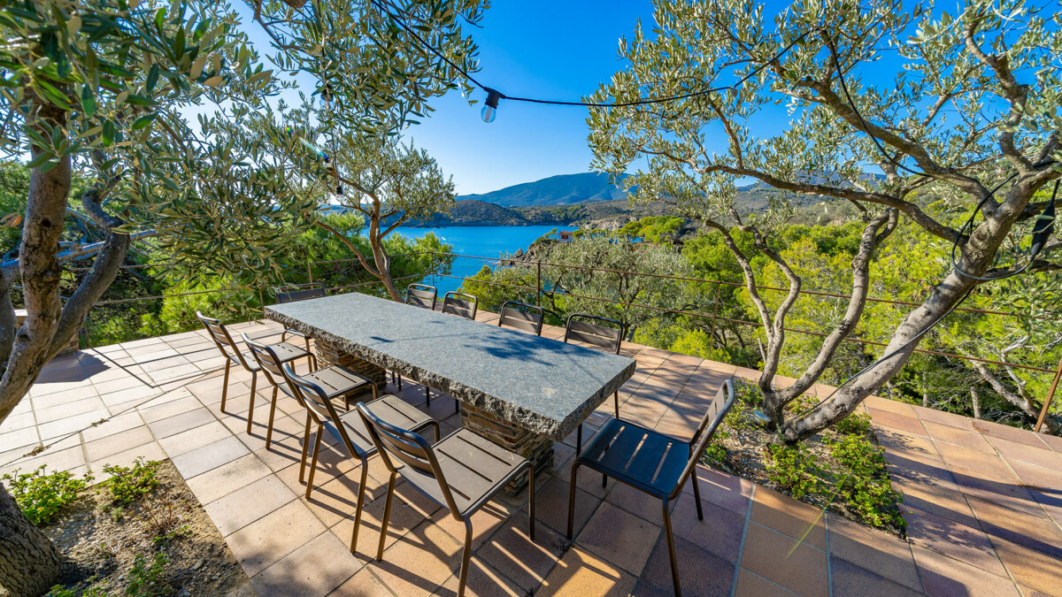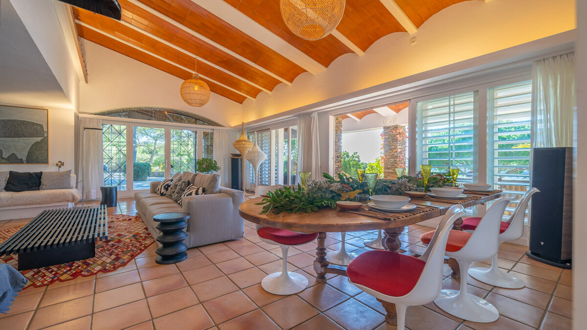 La décoration est chic, zen et raffinée, mêlant mobilier contemporain et œuvres d’art. Cette villa est également très lumineuse, grâce à ses grandes ouvertures donnant sur le jardin, la piscine et la baie de Guillola.