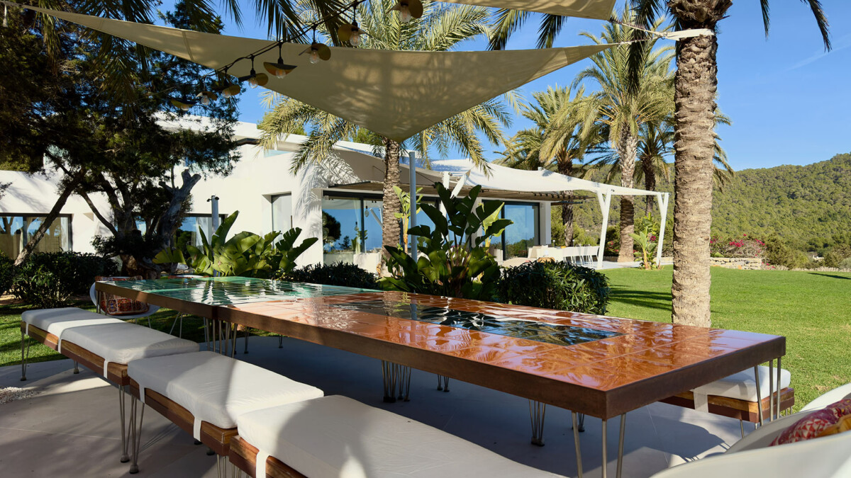 Salle à manger extérieure avec table et chaises pour 12 personnes.