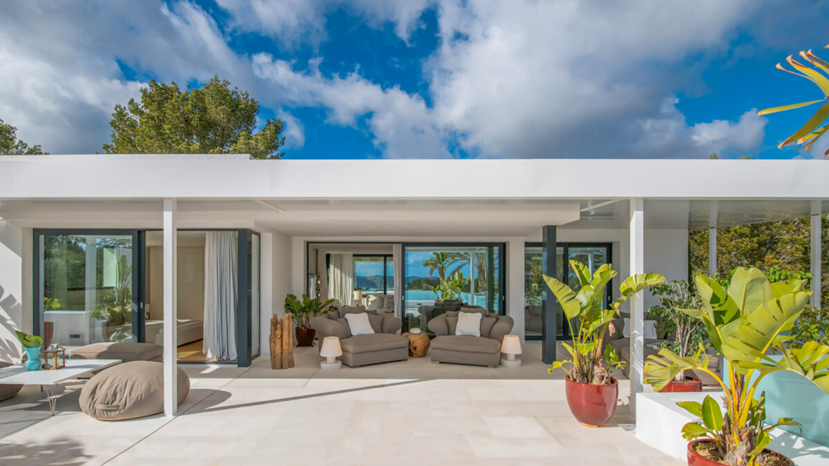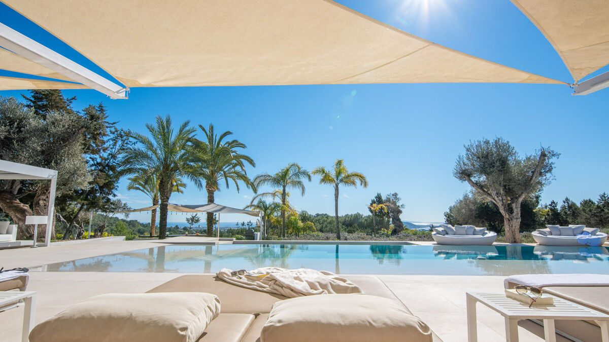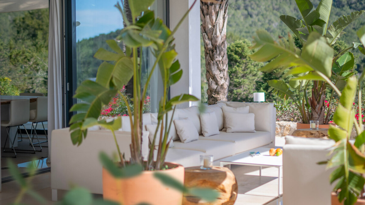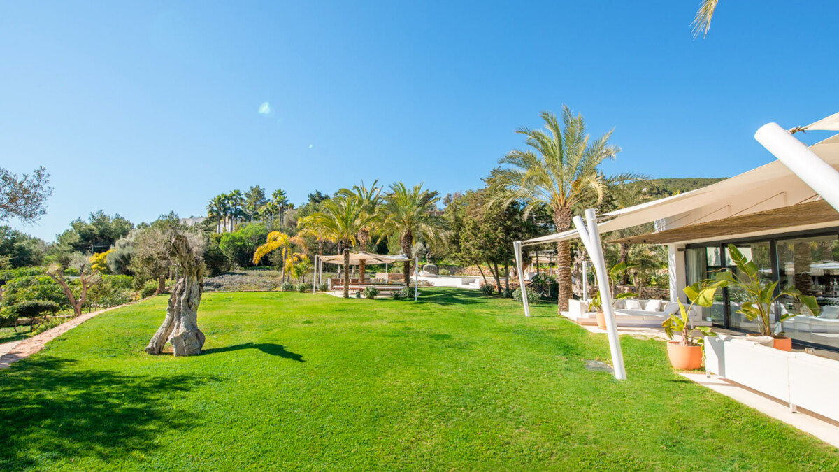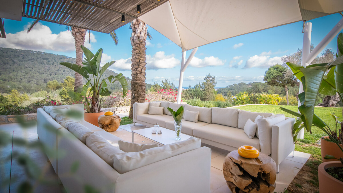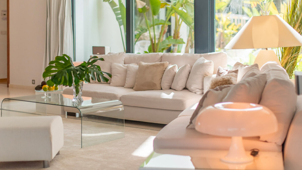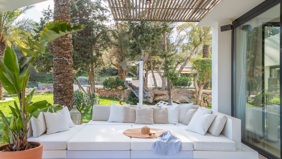 Grand salon avec TV satellite et de grands canapés, entourés de portes coulissantes en verre avec accès au jardin et à la terrasse de la piscine.