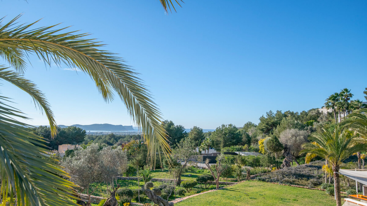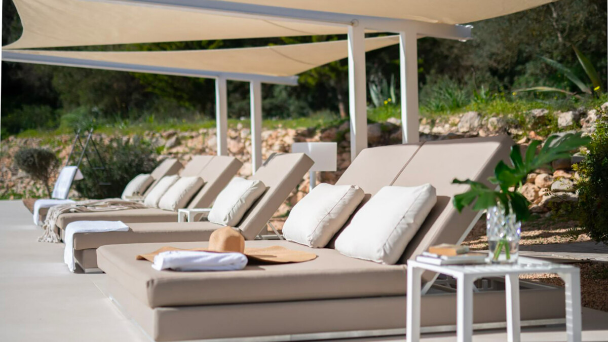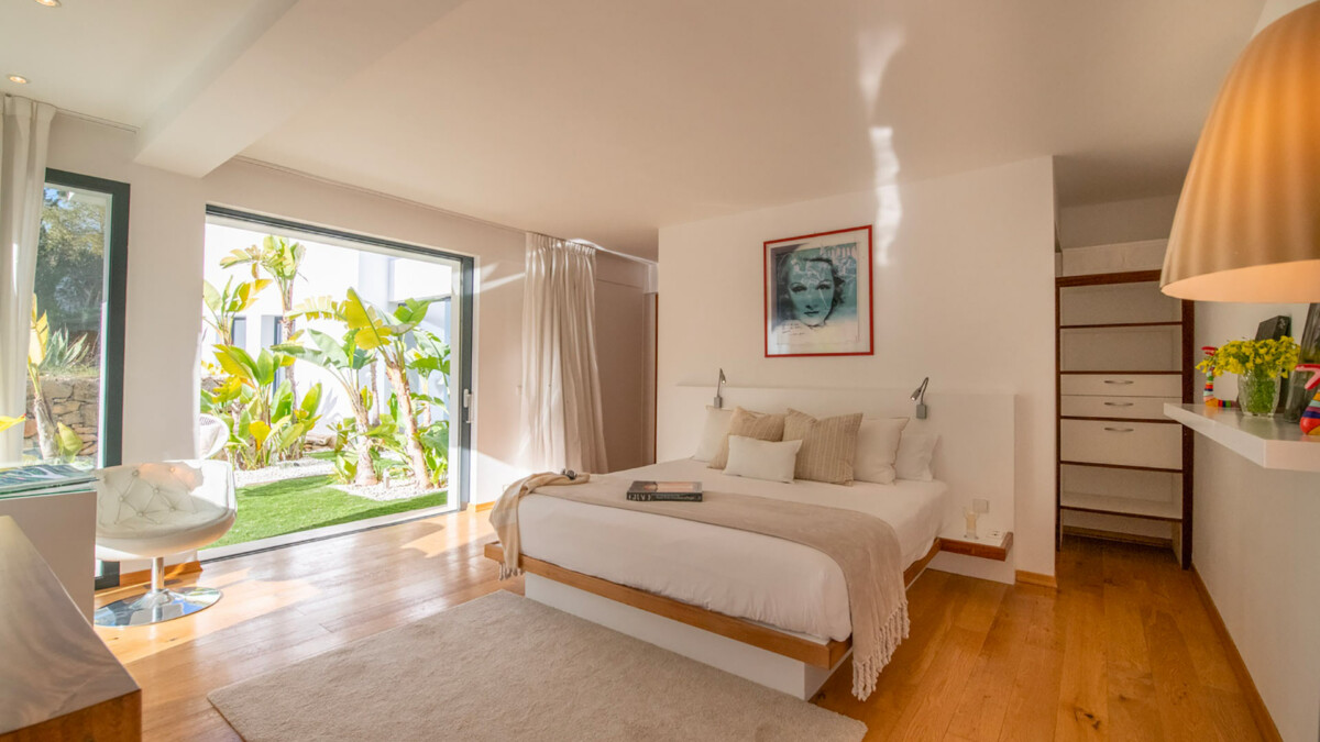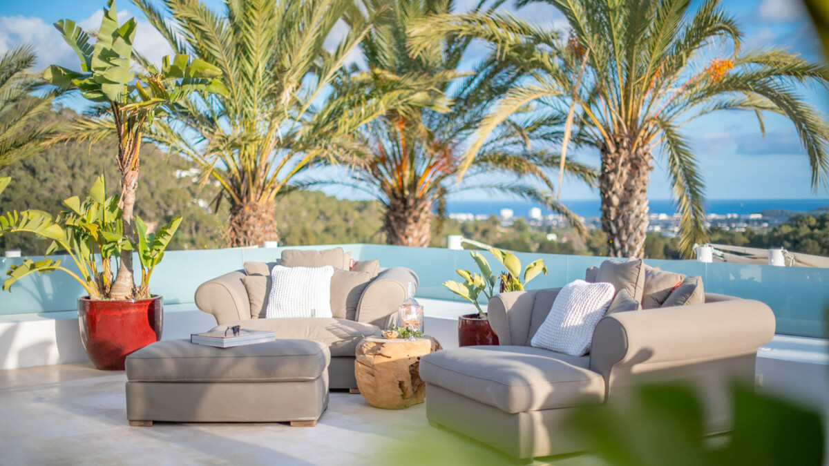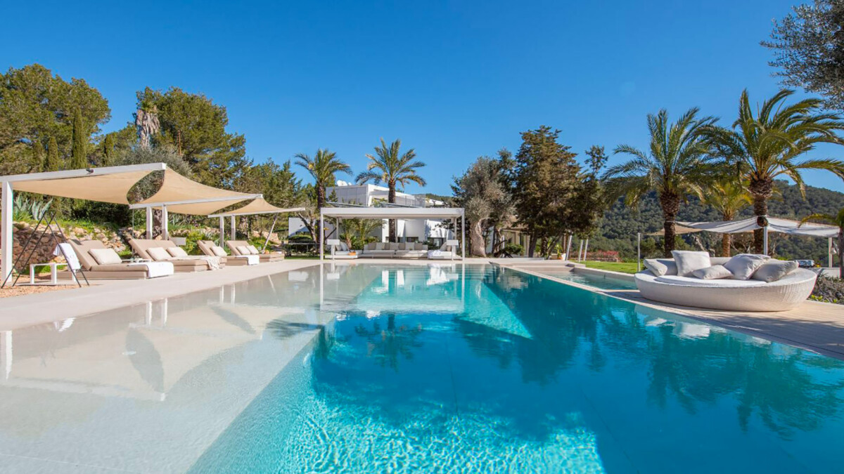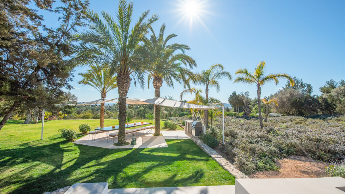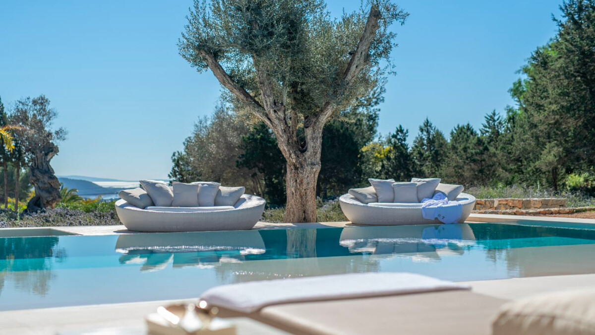 Grand salon avec TV satellite et de grands canapés, entourés de portes coulissantes en verre avec accès au jardin et à la terrasse de la piscine.
