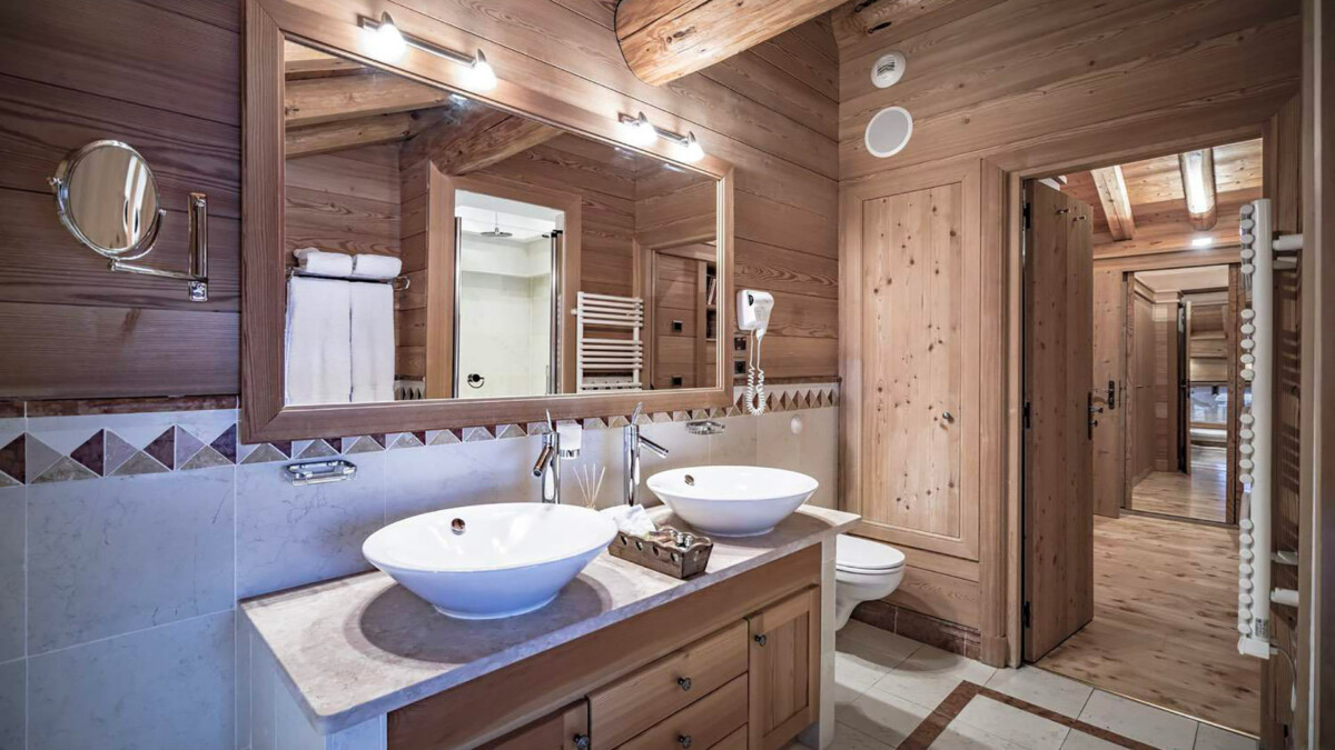 Conçu pour recevoir 12 personnes, le chalet est réparti sur quatre étages, chacun mérité par un ascenseur intérieur. Les 5 chambres sont joliment finies avec du bois et des tissus muraux et ont leur salle de bains en marbre et wc privés.