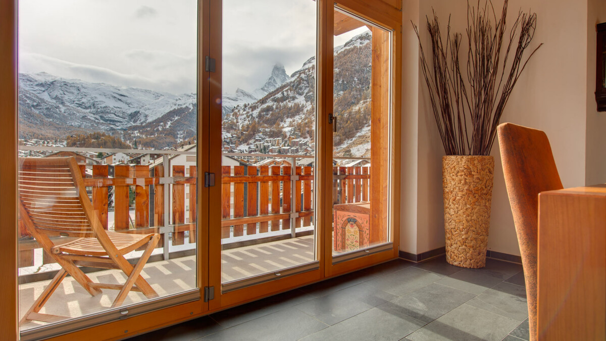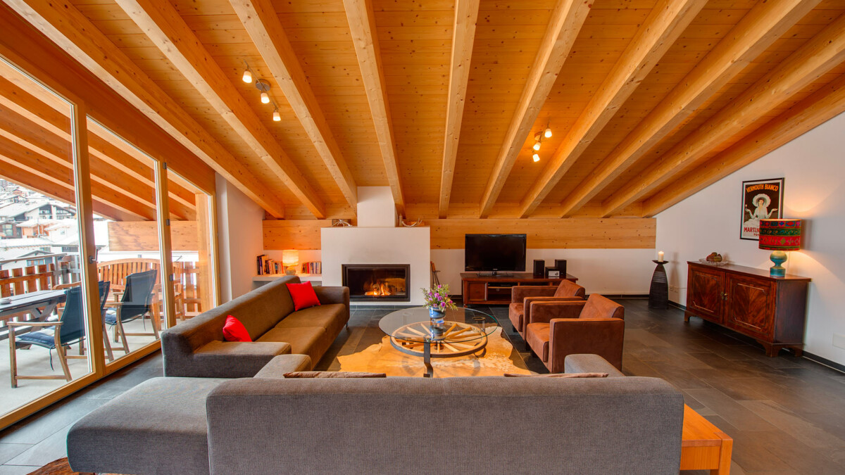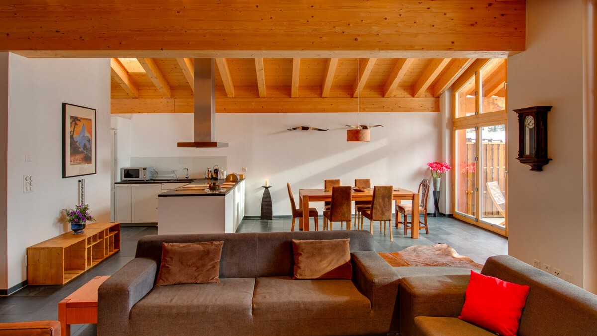 Une superbe cuisine ouverte équipée dernier-cri donne sur la salle à manger avec une grande table en bois et des chaises confortables. Le vaste séjour possède une grande cheminée pour feu de bois, avec des divans et des fauteuils, le tout donnant sur un grand balcon orienté plein sud avec une vue incomparable sur Zermatt.