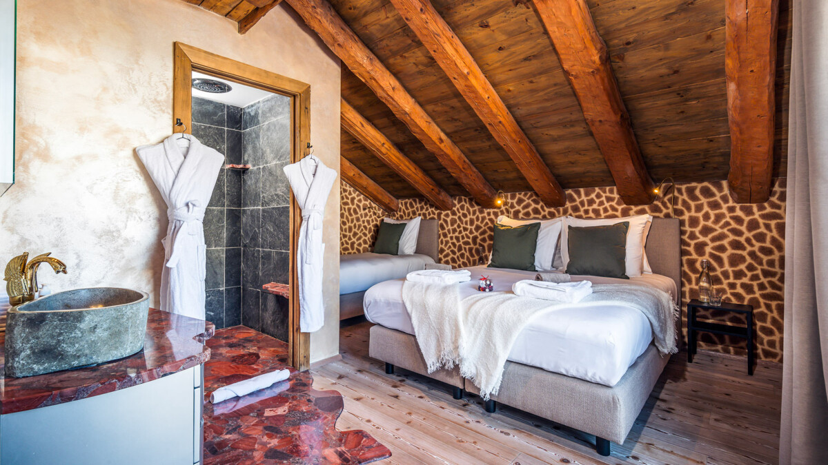 The bedrooms, divided between the main area and a separate annex, all have en-suite bathrooms and high-quality bedding. A mezzanine with three beds provides a suitable space for children.