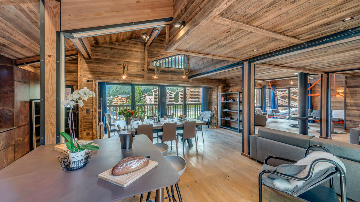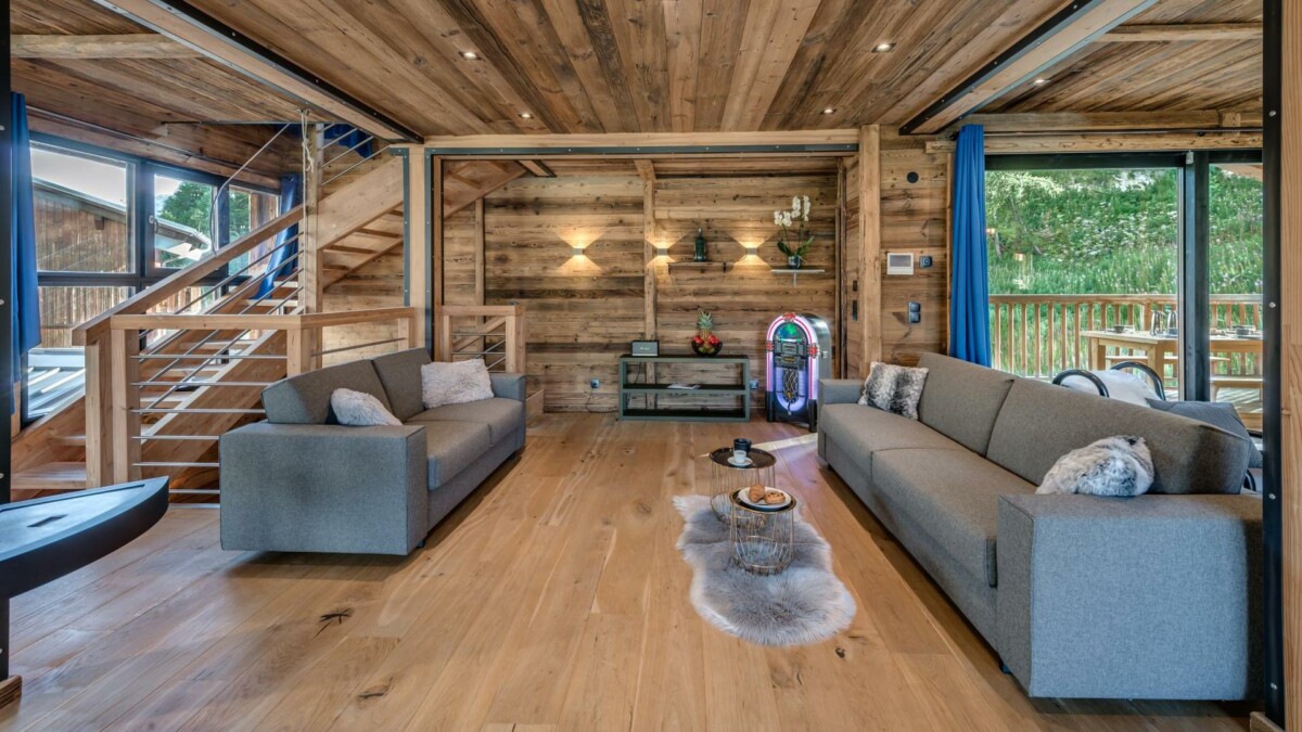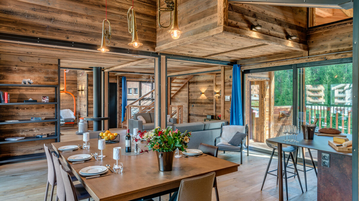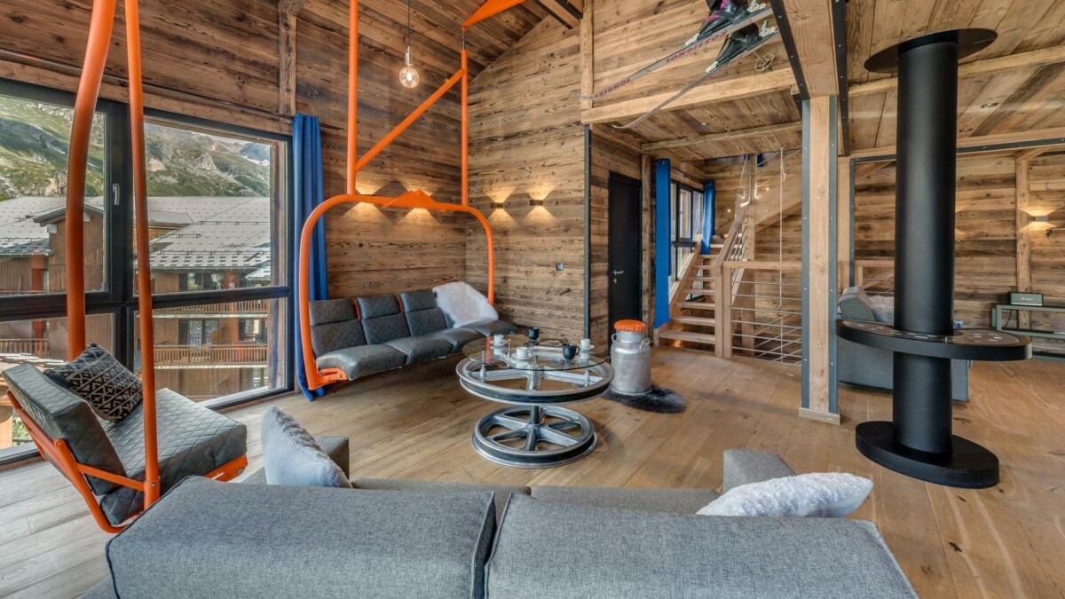 Le Chalet séduit par sa décoration alliant tradition et modernité. Les espaces de vie, dont le salon avec balançoires-télésièges, présentent un mobilier sur mesure et des touches créatives.
