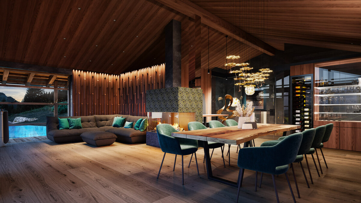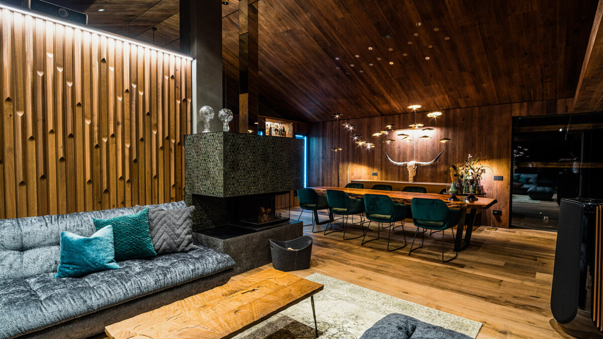 Le cœur du chalet est l’espace de vie ouvert qui se trouve au premier étage. Cette espace dispose de hauts plafonds, d’un spacieux espace repas, d’un confortable canapé et d’une cheminée. Les grandes baies vitrées offrent quant à elles une vue imprenable sur la nature. La pièce comporte aussi un grand écran avec projecteur et système son haut de gamme (Bang & Olufsen), promesse de passionnantes soirées cinéma.