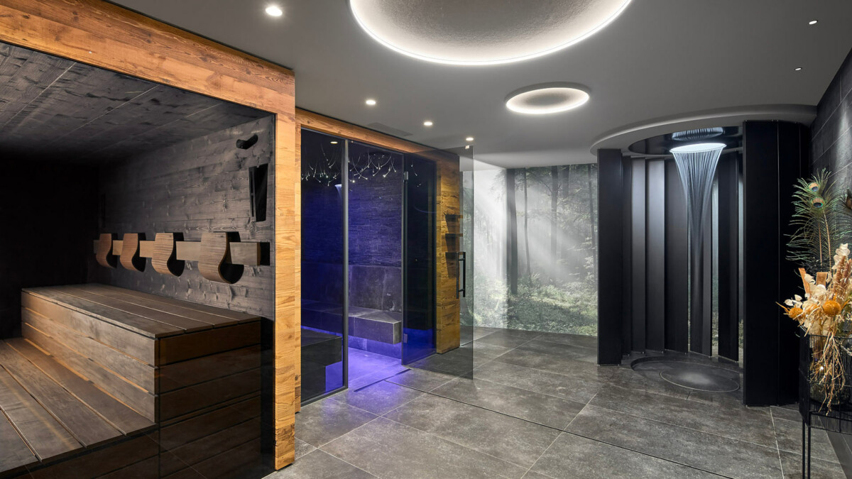 L’espace bien-être (avec zone de relaxation, hammam, sauna finlandais, douche à cascade Aquamoon, douche à neige, tapis de course Technogym et banc multifonctionnel) se trouve au sous-sol. Ici, la grande télévision avec console de jeux et haut-parleurs de haute qualité permettra aux enfants de se divertir.