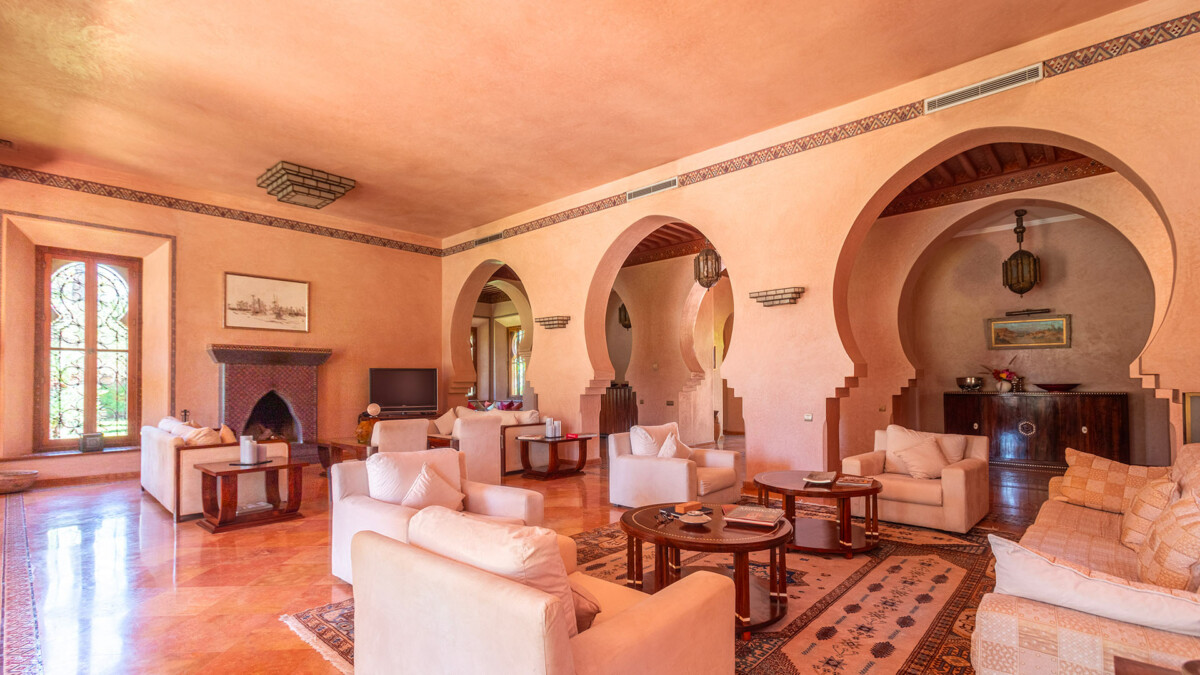 - Au rez-de-chaussée, vous touverez un patio et l’entrée, une chambre avec un lit double avec salon, salle de bain et dressing sans accès extérieur, un salon marocain avec cheminée, un double salon avec cheminée, une salle à manger, une grande cuisine, des toilettes invités, trois chambres avec pour chacune un lit double et salon, salle de bain, dressing et accès terrasse extérieure. Vous y trouverez également une salle de massage et une salle de sport, pièces techniques (buanderie, stock, …).