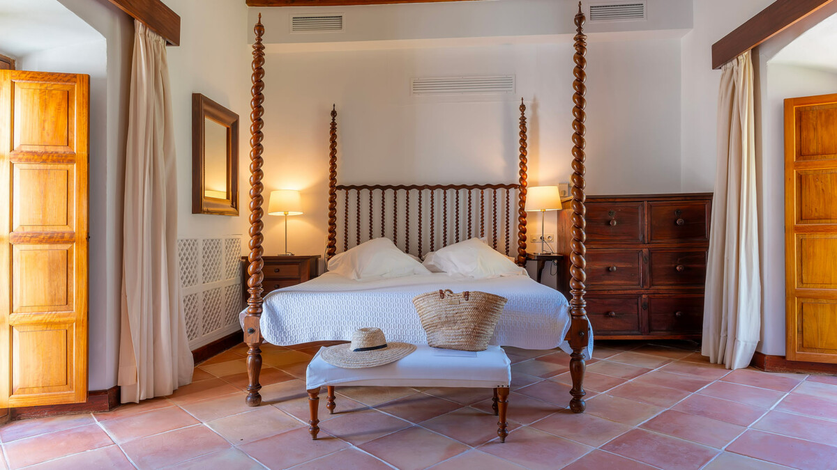 Bedroom 9: Master bedroom with four poster bed and en-suite bathroom (bath and separate shower) leading to the pool terrace