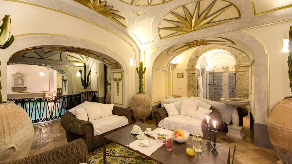 Franchissez les portes de la cour intérieure privée du Palazzo Santa Croce, bordée de vases géants en terre cuite et de carreaux de majolique peints à la main. Continuez à l’intérieur vers le salon, la salle à manger, la cuisine et le grand escalier du rez-de-chaussée menant au spa ou aux chambres au-dessus.