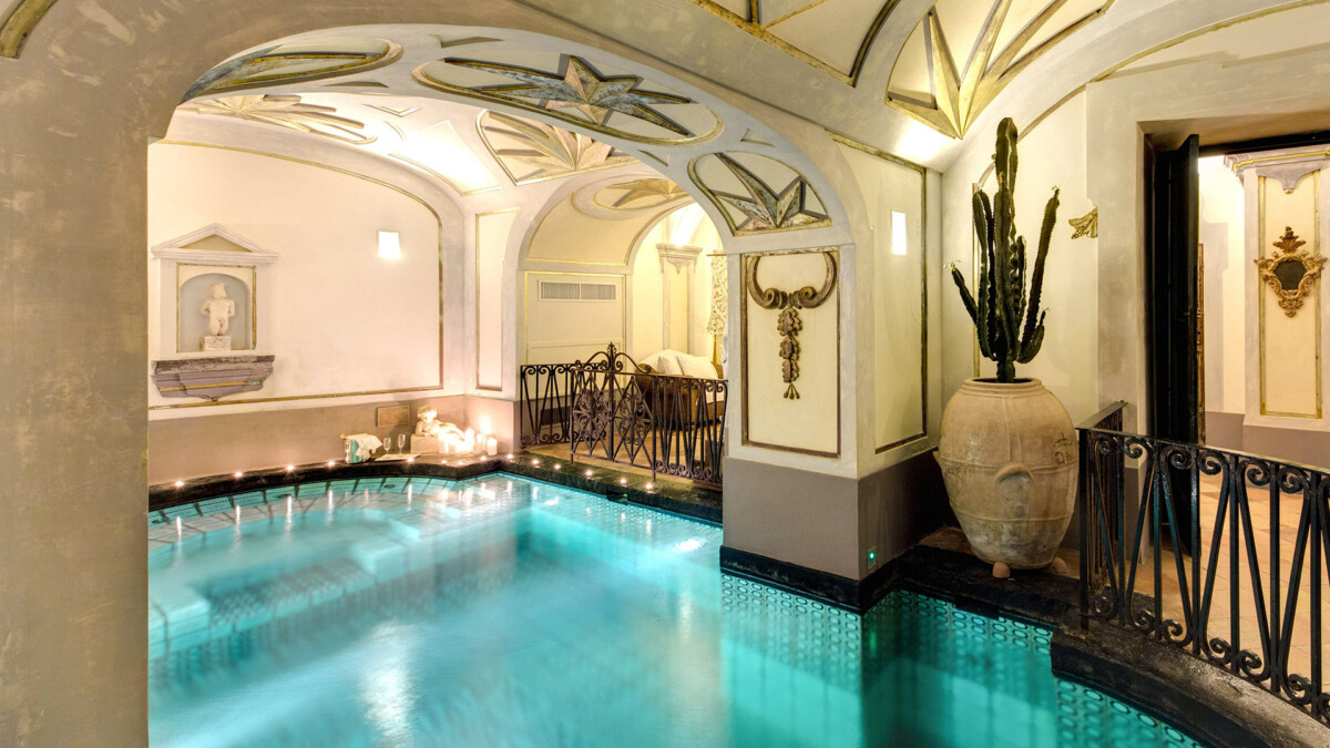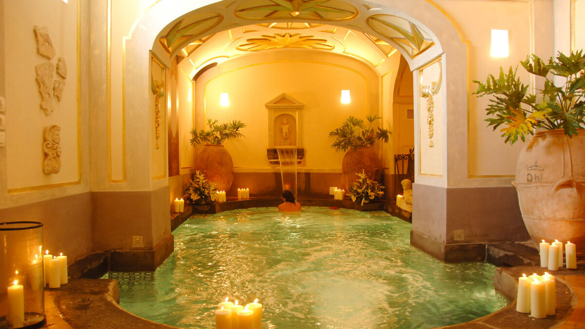 - En bas, la zone Salus Per Aquam dispose d’une piscine intérieure bordée de carreaux de majolique traditionnels de la côte amalfitaine et comprend des jets de massage sur les murs et le siège, une cascade et une nage à contre-courant.