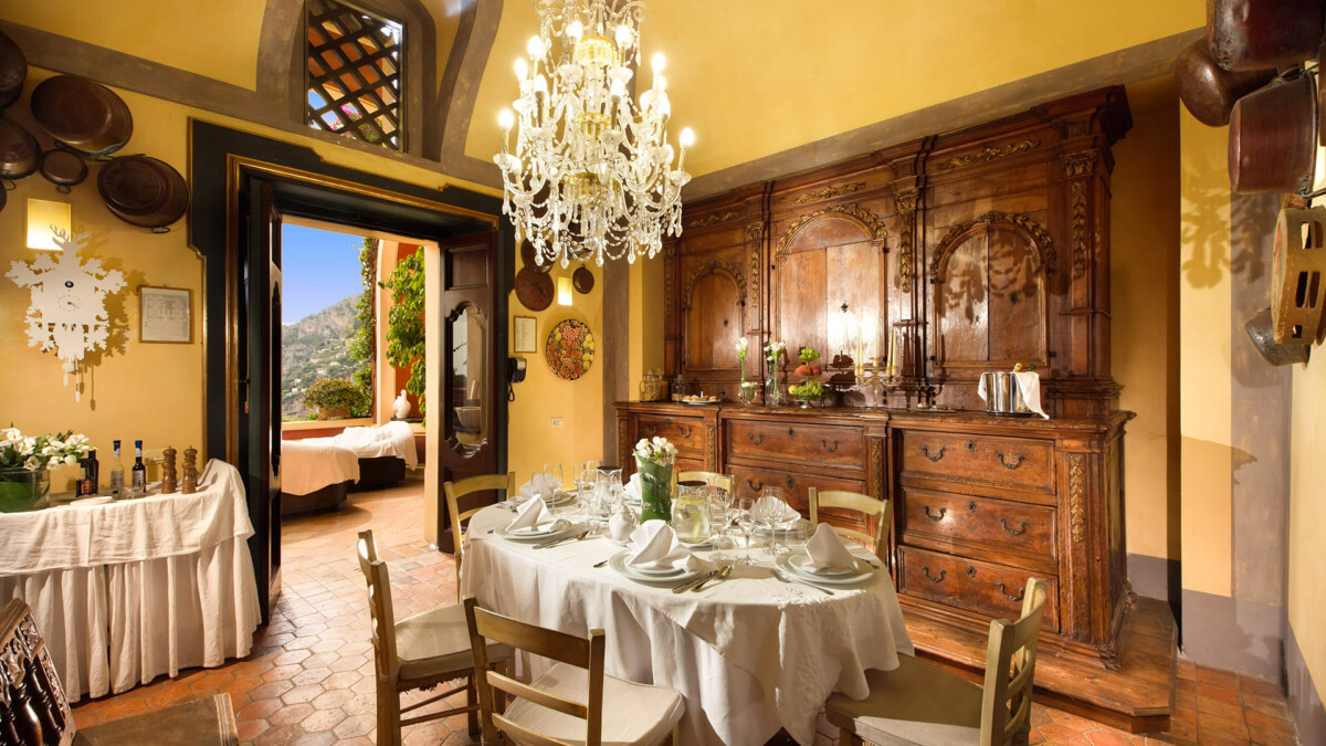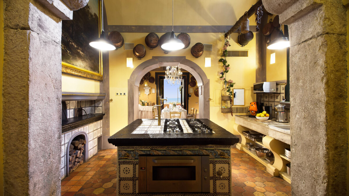 - La cuisine antique et arcadienne cache des appareils haut de gamme et modernes nichés entre les arcades en pierre et les éviers en marbre. L’énorme armoire en bois date de l’époque baroque et les deux fours à pain et à pizza sont encastrés directement dans les épais murs de pierre décorés de carreaux de faïence antique.