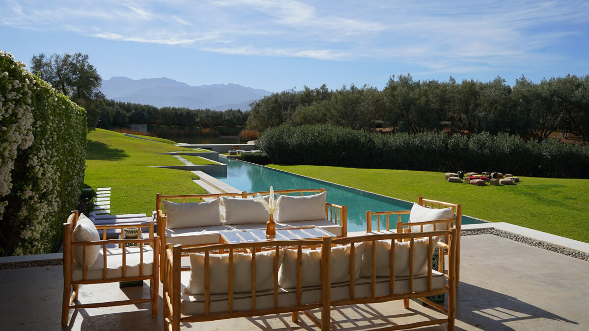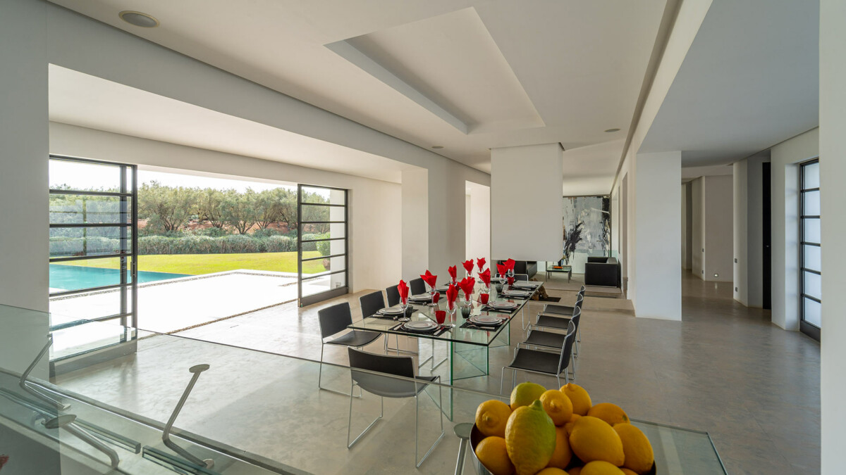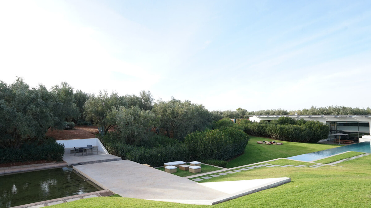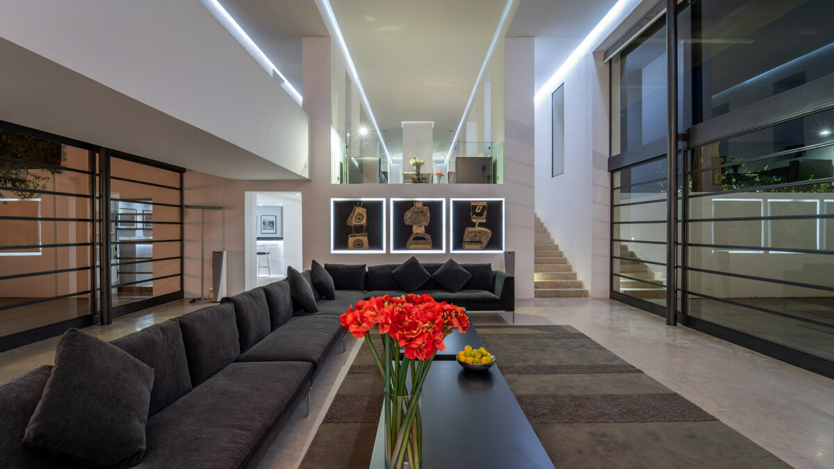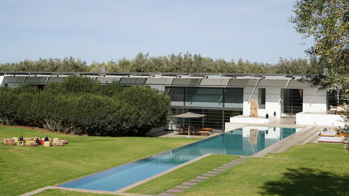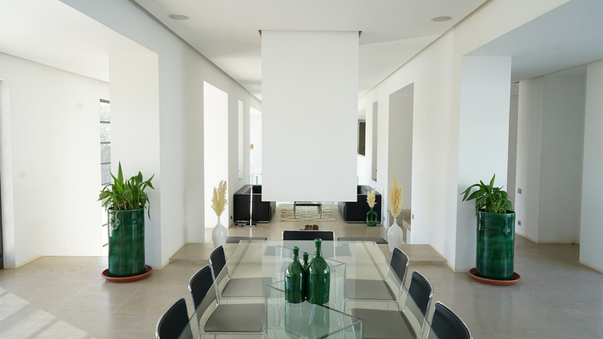 La villa a été construite sur deux niveaux (par rapport à la cour) afin de maximiser la vue sur les jardins et le versant sud des montagnes de l’Atlas. Le concept linéaire de la maison assure la simplicité fonctionnelle, ainsi que les larges fenêtres coulissantes, le mobilier minimal et les matériaux utilisés pour le sol et les murs.