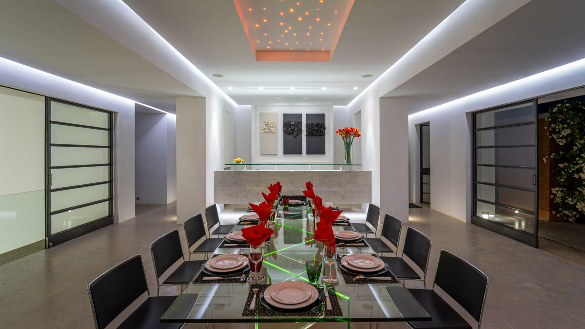 Au niveau inférieur se trouvent le bar d’hiver, le hammam, la salle de cinéma et le salon principal profitant de la double hauteur et maximisant ainsi la vue sur le paysage.