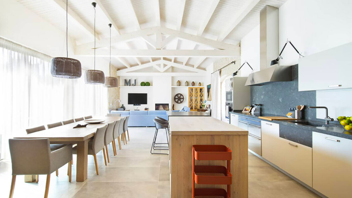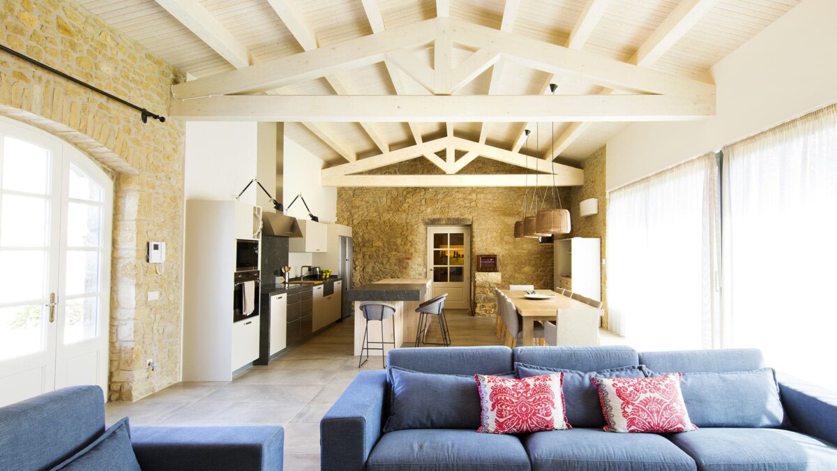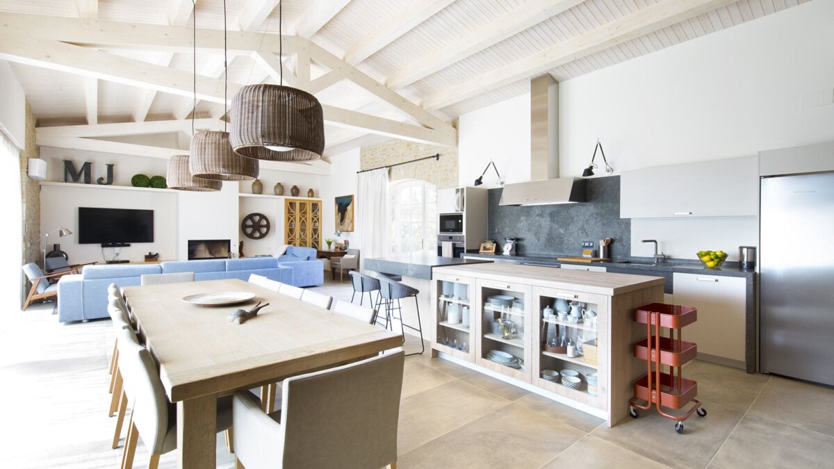 Vous trouverez dans la villa un grand espace épuré et design comprenant la cuisine, la salle à manger et le salon avec TV et cheminée.