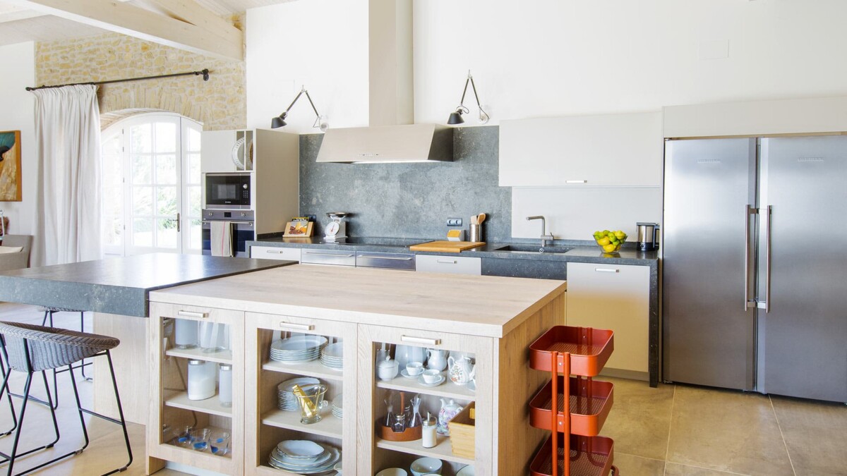 La cuisine équipée est ouverte sur l’espace repas et s’ouvre sur le porche qui dispose d’un espace lounge et d’un espace repas, idéal pour profiter de moments de détente ou pour partager de délicieux repas en extérieur.