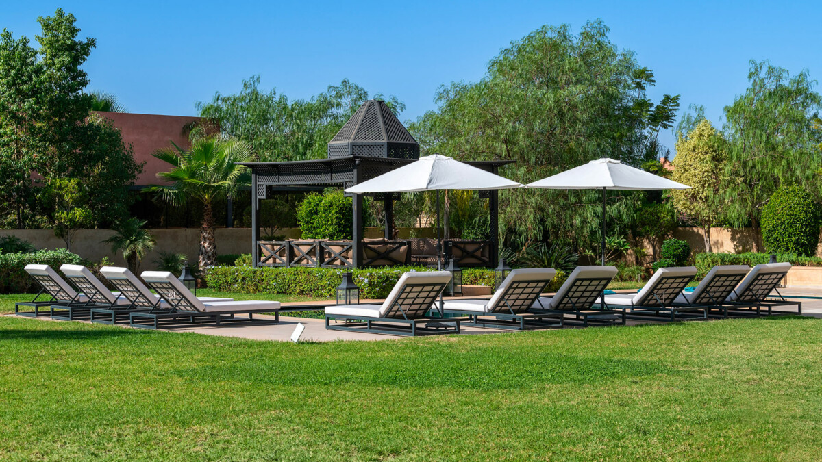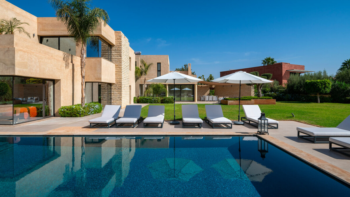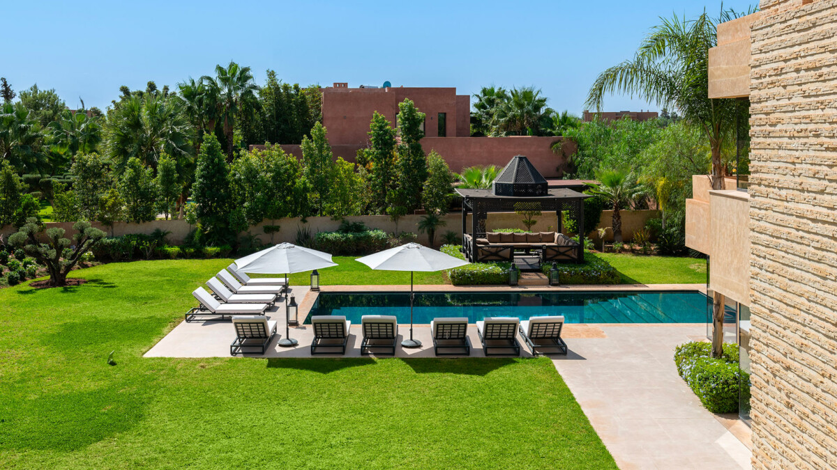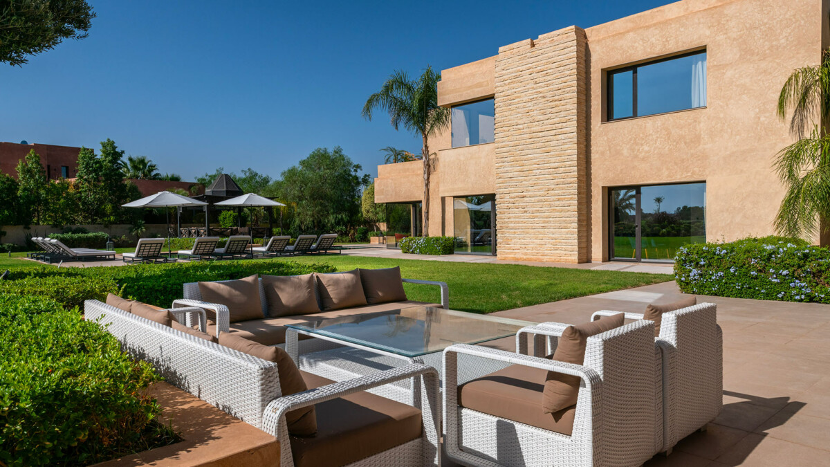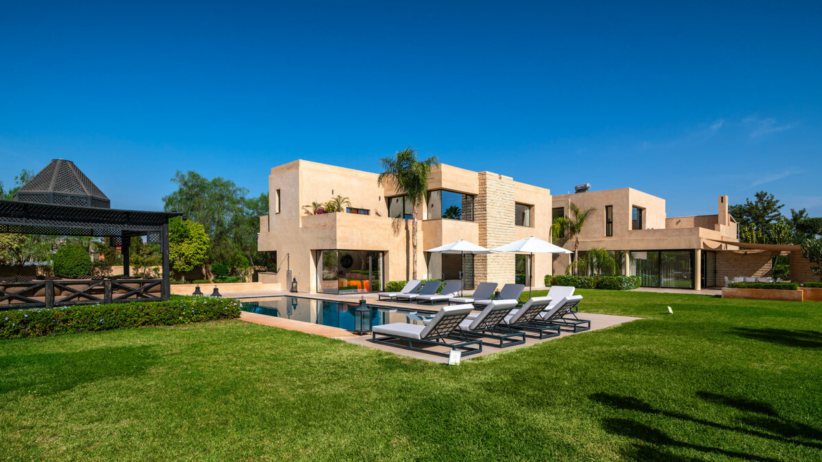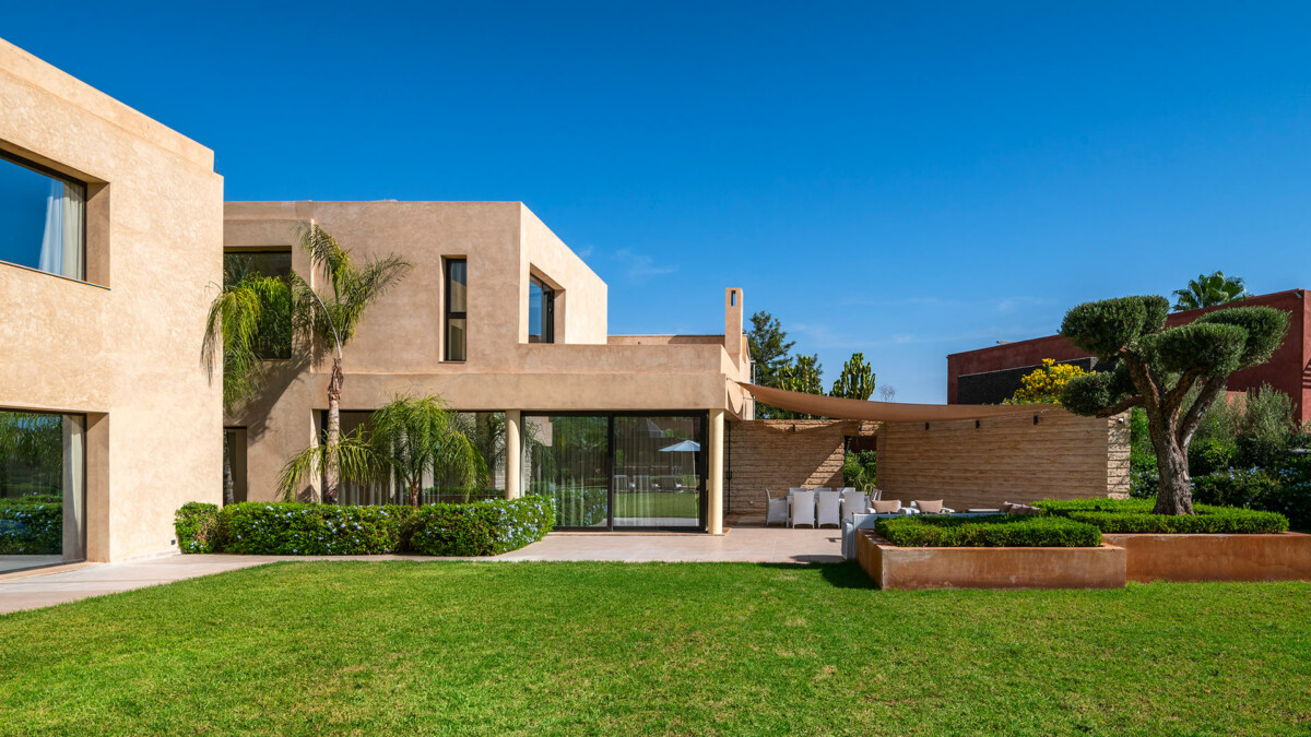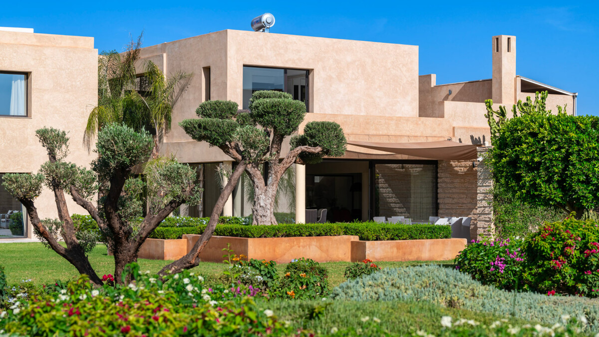 La villa prend place sur un généreux terrain de 2 240 m², en première ligne de golf (devant le trou 4) et profite d’une sublime orientation avec une vue incroyable sur les montagnes de l’Atlas.