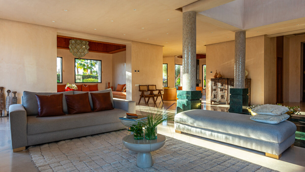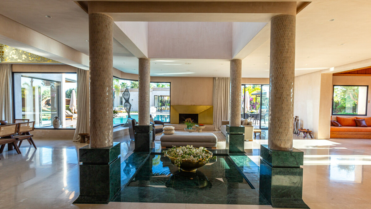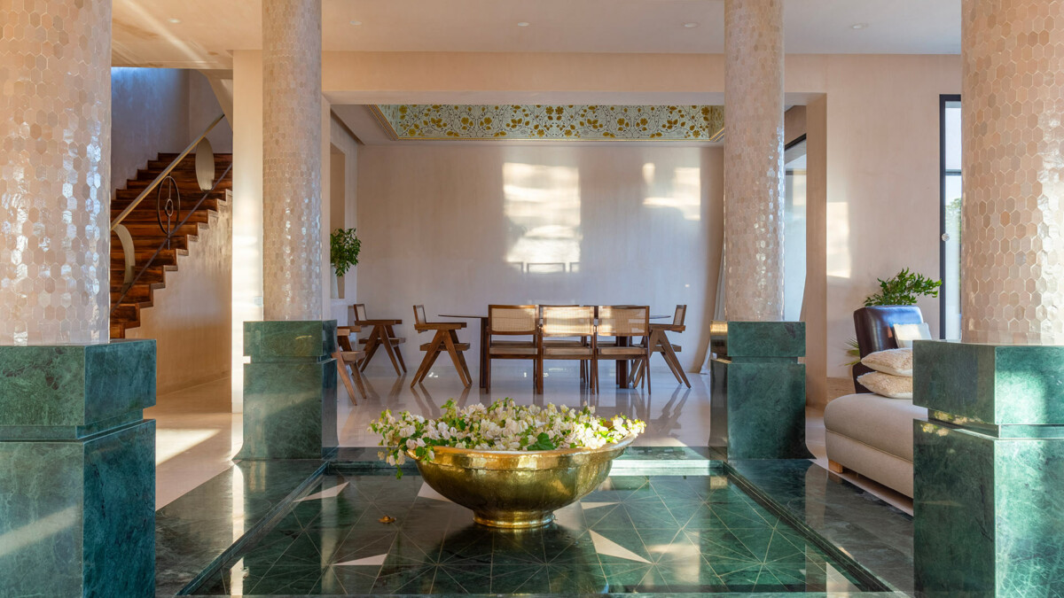 À l’intérieur, chaque espace a été conçu comme un sanctuaire d’art et d’histoire. L’attention portée à la décoration célèbre l’artisanat local, des sculptures de portes aux fresques des escaliers, sans oublier la fontaine et la luminosité féérique filtrée par la somptueuse verrière de la cuisine. Ces éléments, rappelant les symboles du Maroc tels que la Lune et la demi-lune, imprègnent la demeure d’une âme captivante.