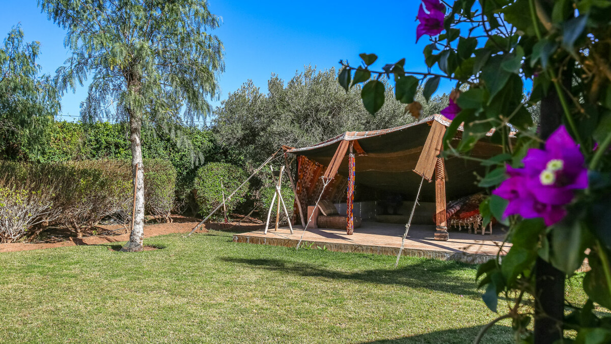 Vous retrouverez aussi dans le jardin une charmante tente berbère, soigneusement aménagée pour une expérience unique sous le ciel étoilé marocain.