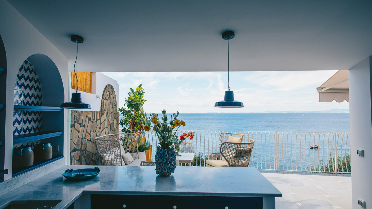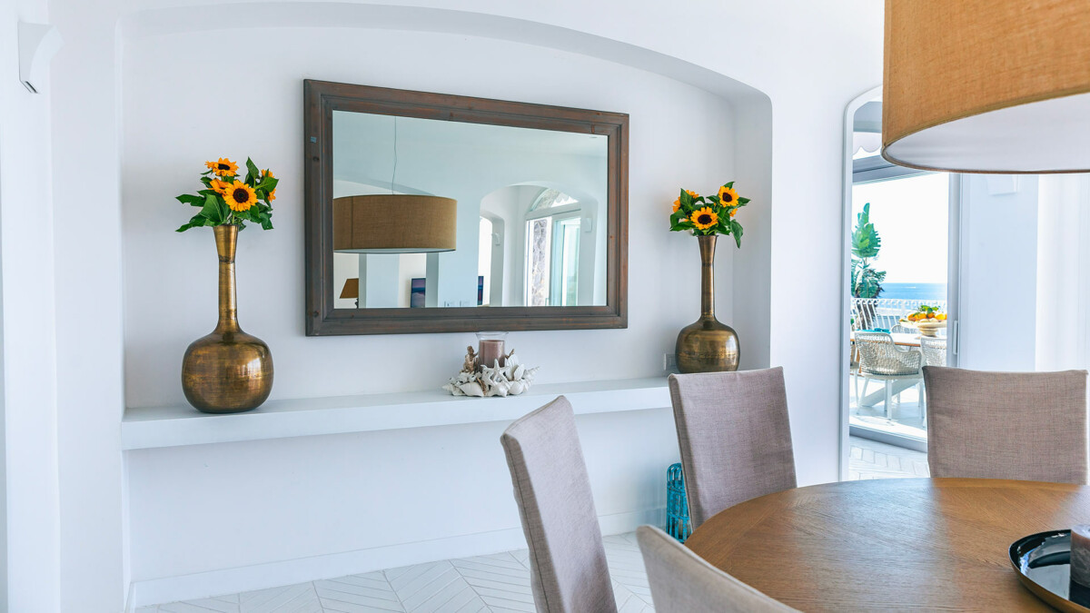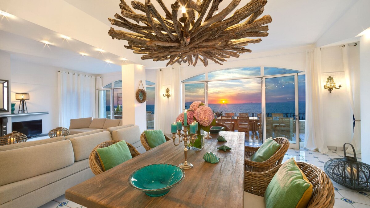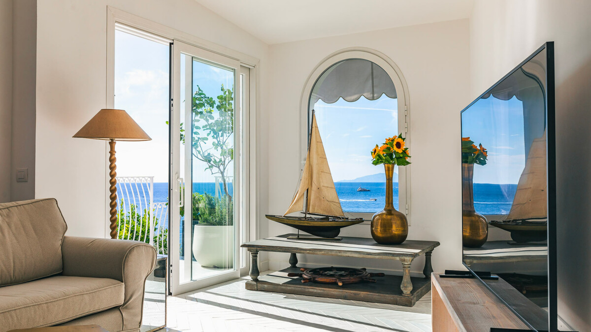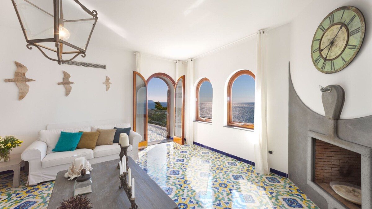 Ce niveau de la villa comprend un grand salon avec une cheminée et une terrasse spacieuse avec vue sur la mer sur le golfe de Naples et l’île et Capri.