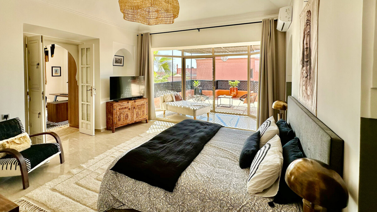 Chambre, 1er étage. La chambre propose 1 lit double 180 cm. Salle de bain privée, avec douche. WC dans la salle de bain. La chambre inclut également : climatisation, table de bureau, TV, coffre fort, dressing, terrasse privée.