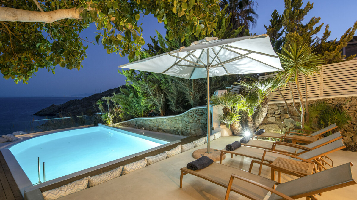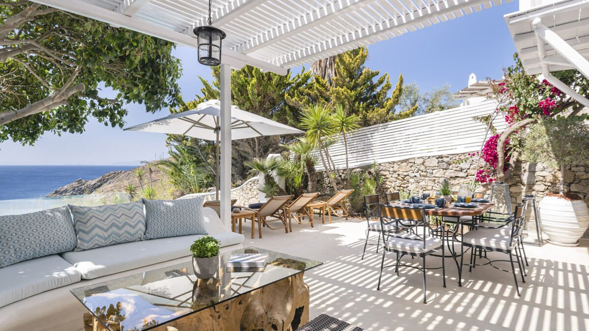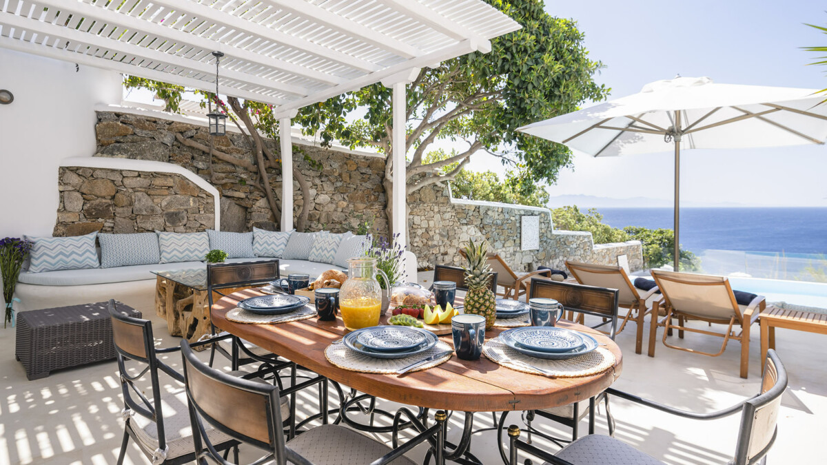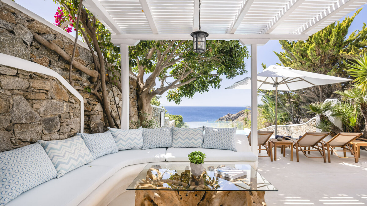 The exclusive Aleomandra peninsula lies at the southestern shore of Mykonos facing the island of Delos. Villa Rival is located at a seaside spot in Aleomandra overlooking the Aegean Sea. The renowned beaches of Ornos and Agios loannis are in a short distance while the cosmopolitan Mykonos town lies about 4km away.