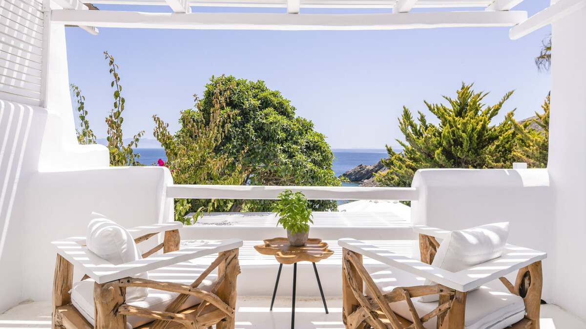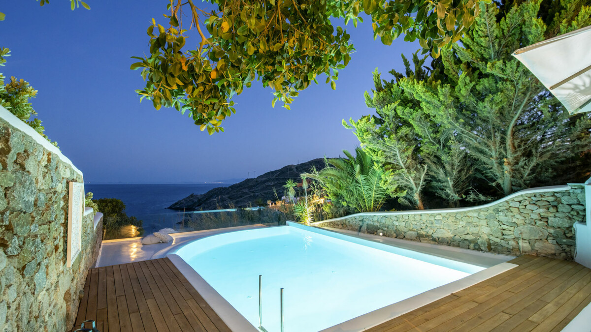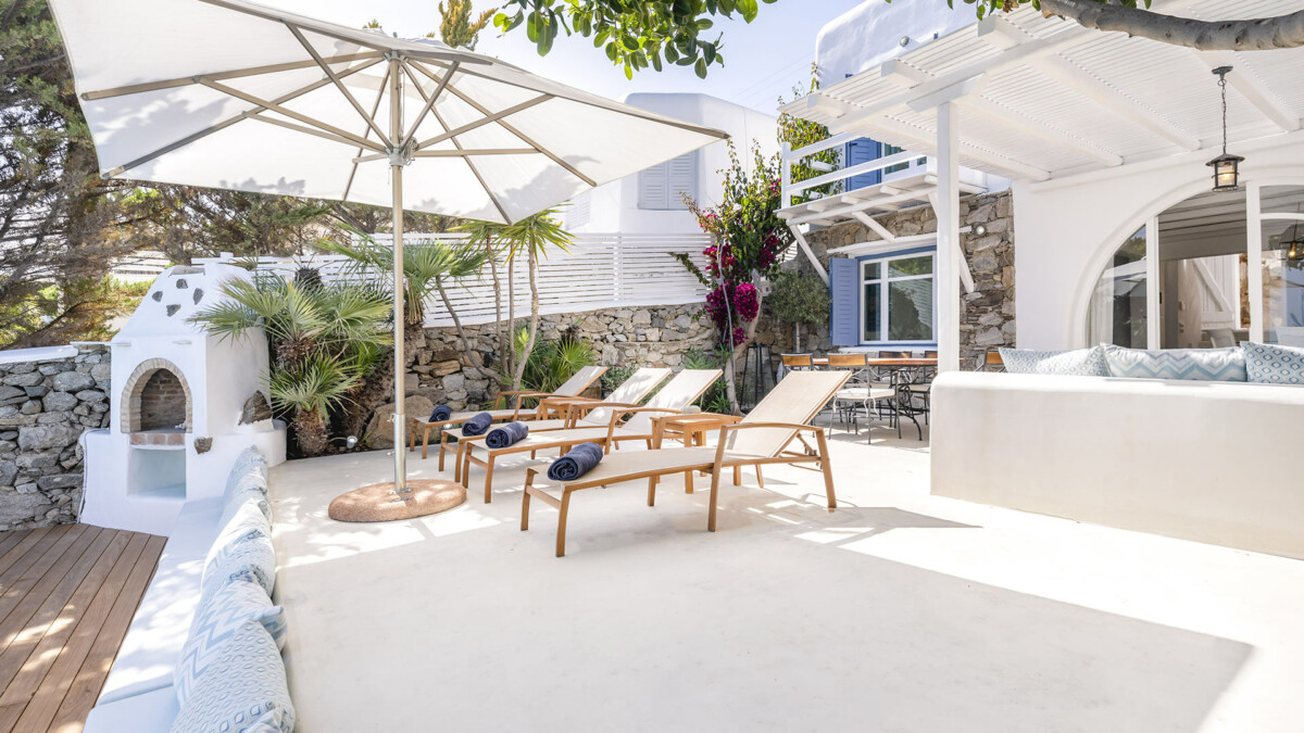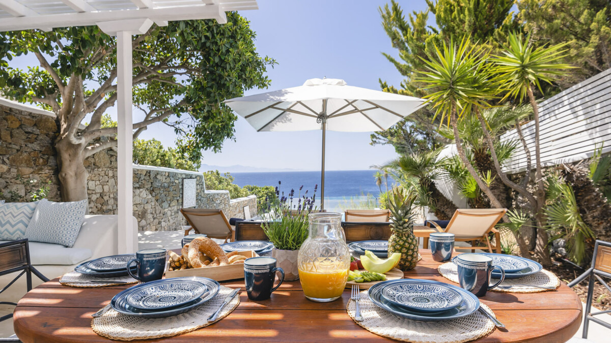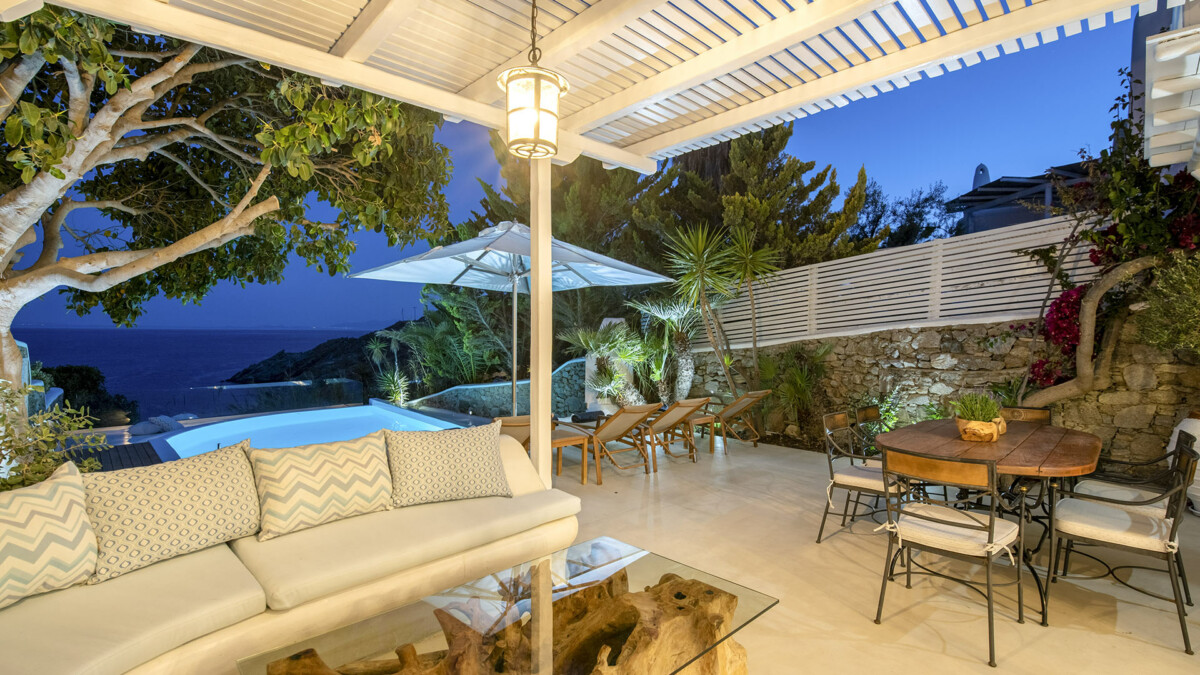The exclusive Aleomandra peninsula lies at the southestern shore of Mykonos facing the island of Delos. Villa Rival is located at a seaside spot in Aleomandra overlooking the Aegean Sea. The renowned beaches of Ornos and Agios loannis are in a short distance while the cosmopolitan Mykonos town lies about 4km away.