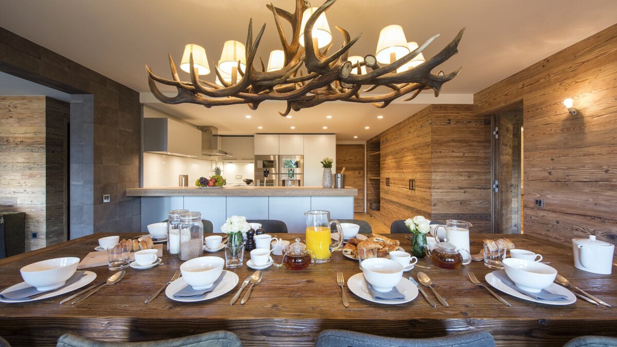 Très lumineux et spacieux, l’appartement dipose d’une grande cuisine moderne entièrement équipée ouverte sur la salle à manger et sa majestueuse table en bois.