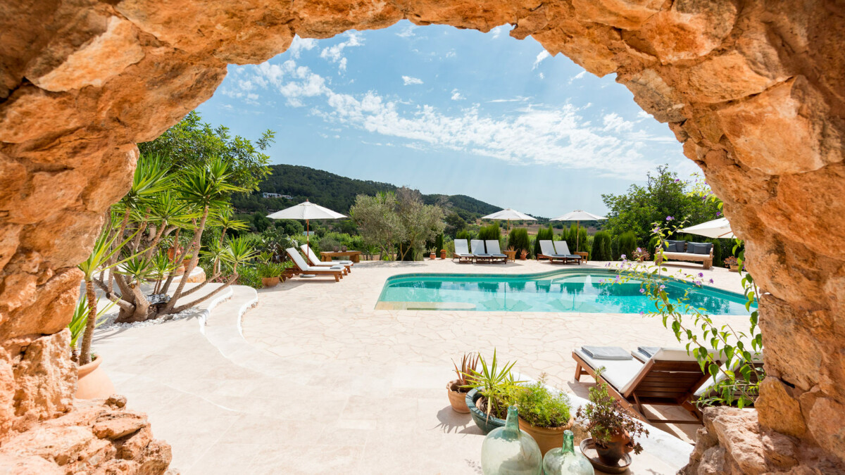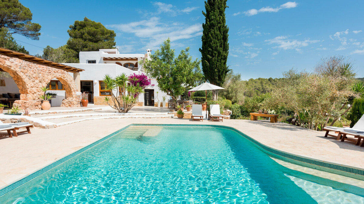 L »extérieur de la villa offre une piscine d’eau salée, idéale pour se rafraîchir et se détendre sous le soleil d’Ibiza. La piscine est entourée de chaises longues pour profiter pleinement de l’été à Ibiza.