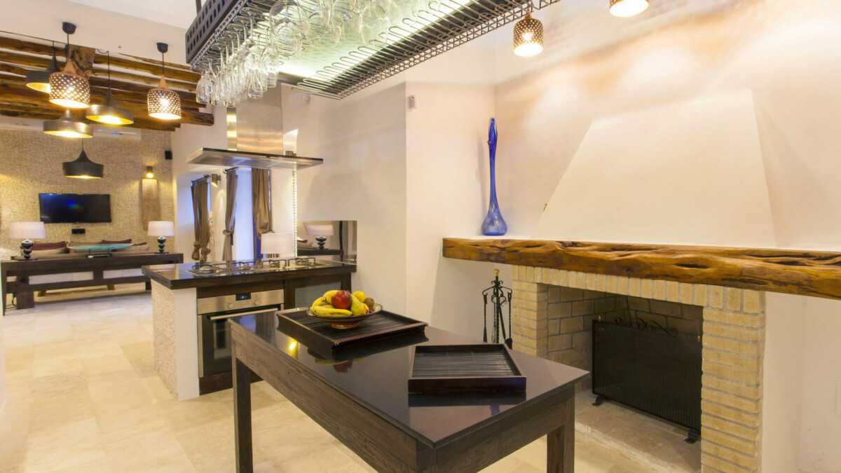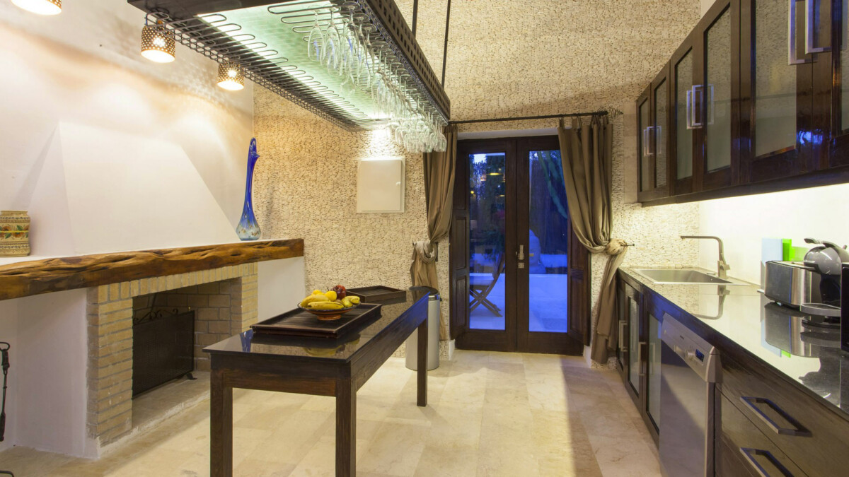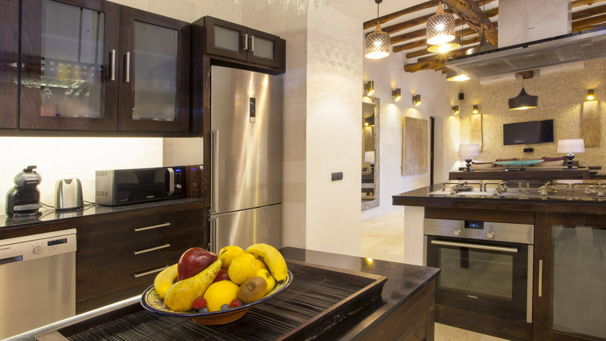 Cuisine ouverte très bien équipée avec cuisinière à gaz, hotte aspirante, four électrique, microondes, machine à laver la vaisselle (siemens), frigo, presse fruits, cafetière Nespresso, batteur électrique, grille-pain, bouilloire d´eau,…