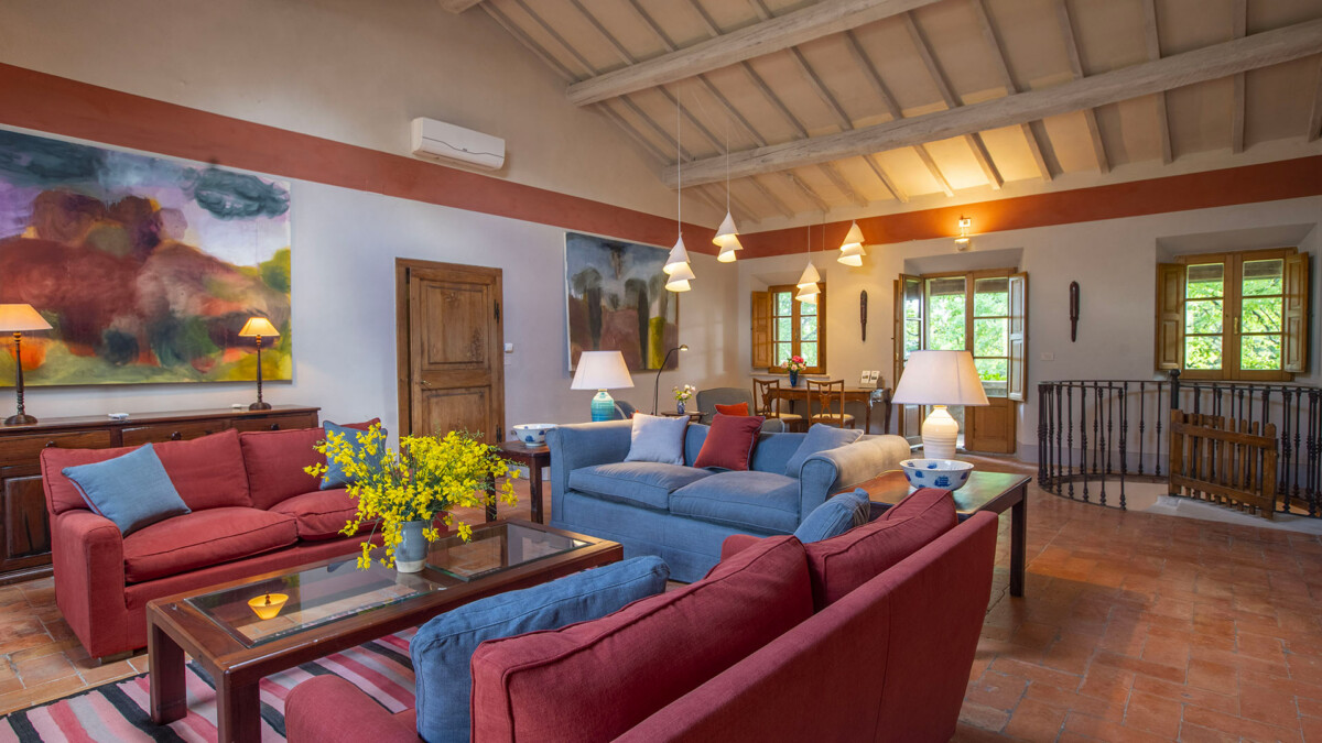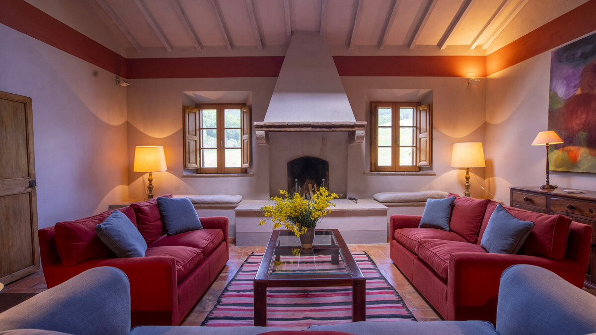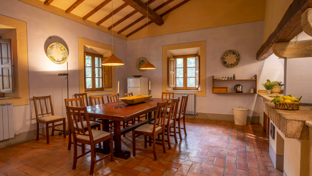 A spiral Renaissance-style travertine staircase leads to the upper floor. Here a stunning central living room with windows looking out on both sides, a fireplace and a large African hardwood dining table leads into a large Tuscan kitchen with an old beam and local travertine hood running along one wall. A waist-high fireplace is a local feature which makes it easy to cook over the fire. The kitchen walls have been painted a stunning blue lime wash in the characteristic style of the old kitchens in peasant farms, as blue was supposed to keep the flies away in the summer. As you will see from the plan of the house two bedrooms have en suite bathrooms while two share a bathroom.