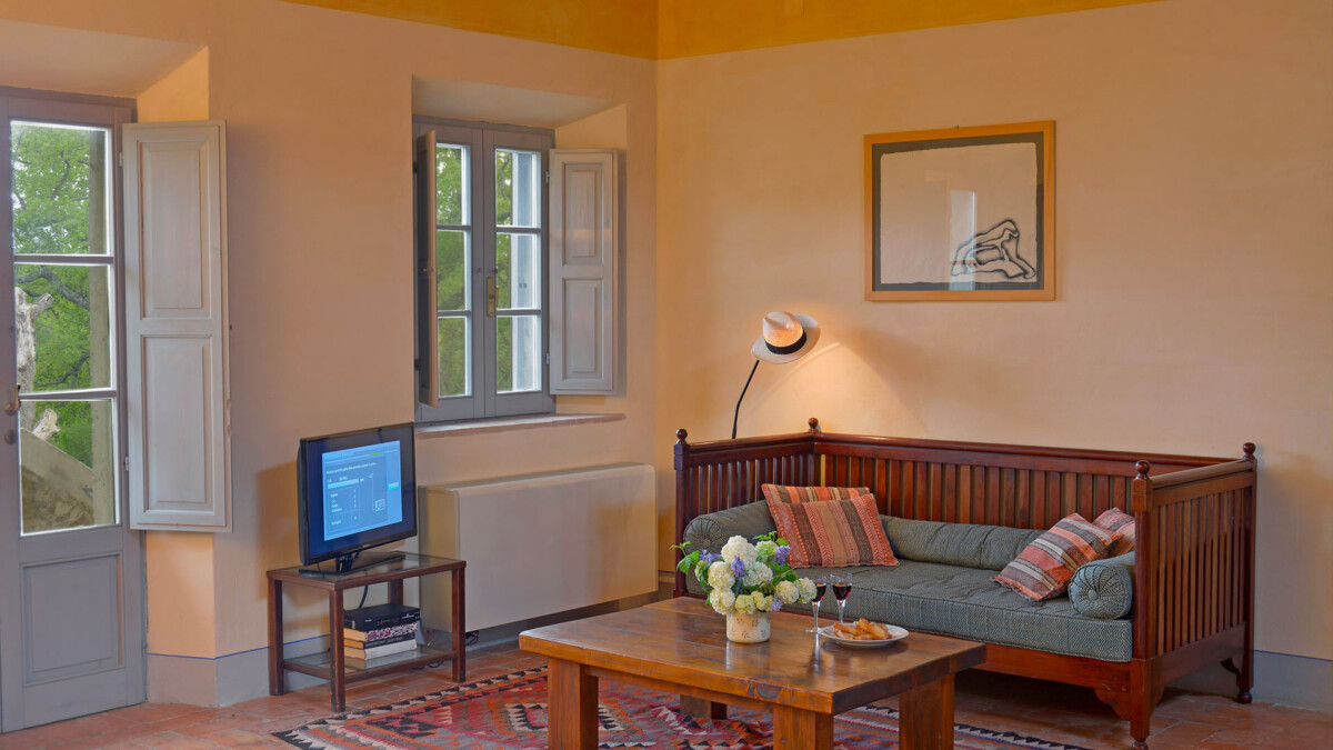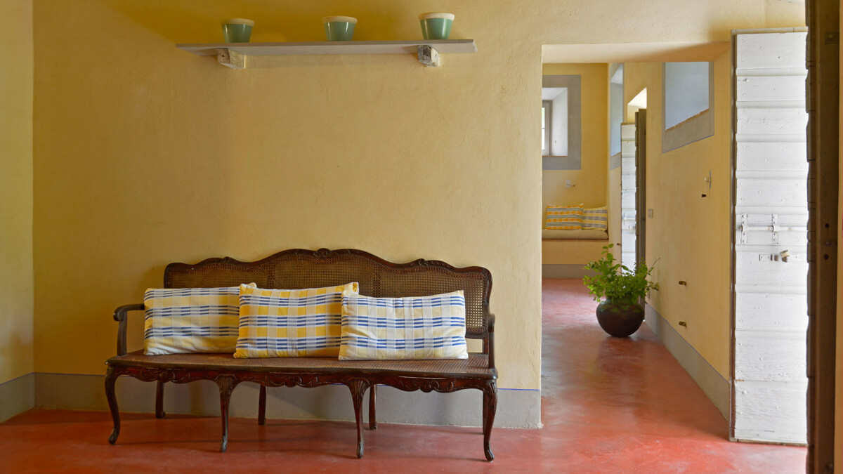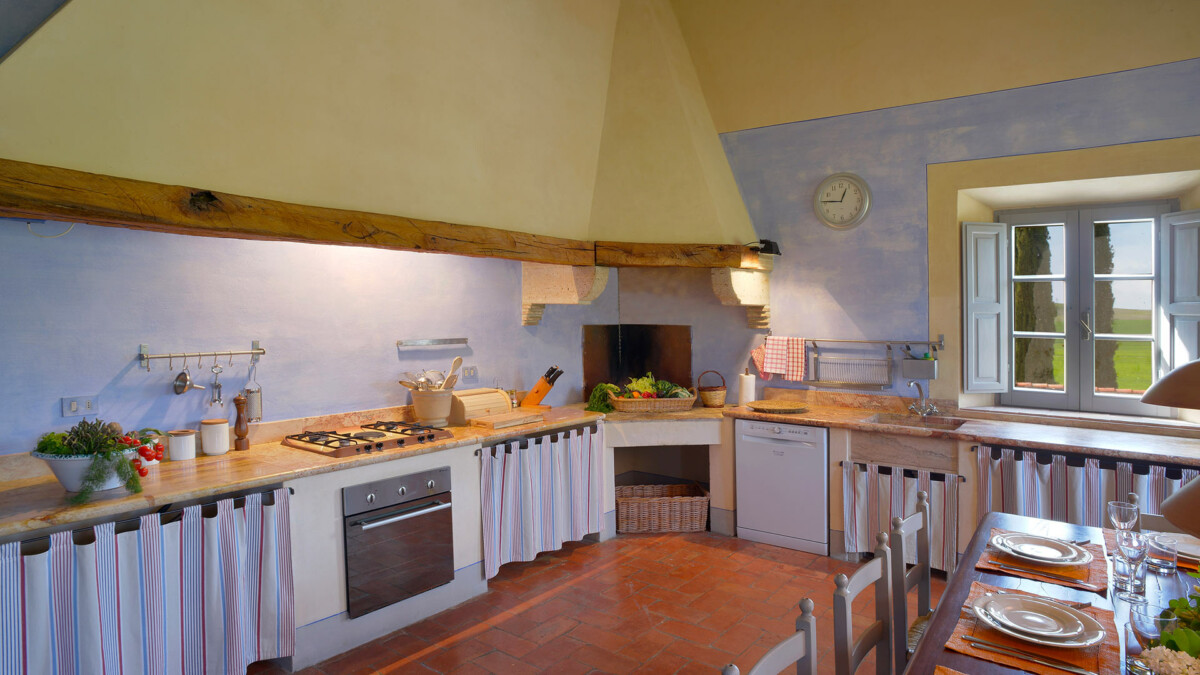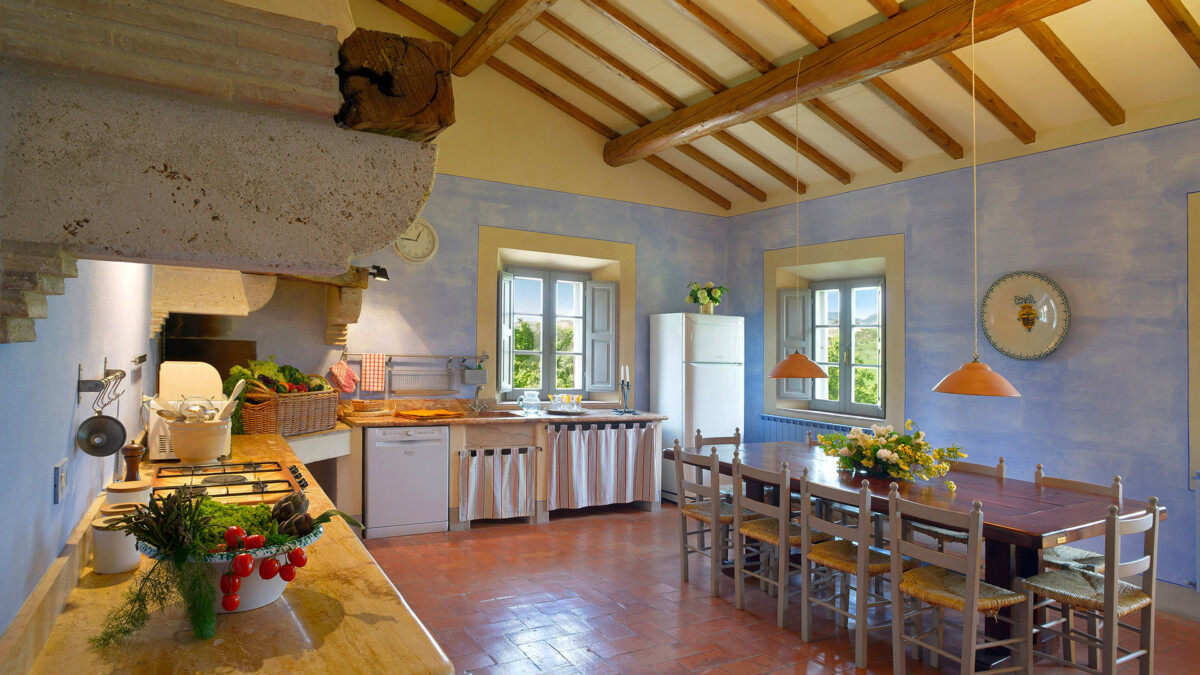 The main living quarters are on the first floor, which is reached by an external staircase leading into a large living room with an open fireplace. The walls have been lime-washed in a sunny light shade. The adjacent kitchen has a typically Tuscan kitchen range and hood, with a fireplace at the same level to make cooking over the fire easier. The walls have been painted a stunning blue lime wash, in the characteristic style of old kitchens in peasant farms, as blue was supposed to keep the flies away in the summer. The cow-shed on the ground floor has been converted into a large summer room which looks out onto the garden. A double room with 2 original antique beds and its en-suite bathroom are also on the ground floor.
