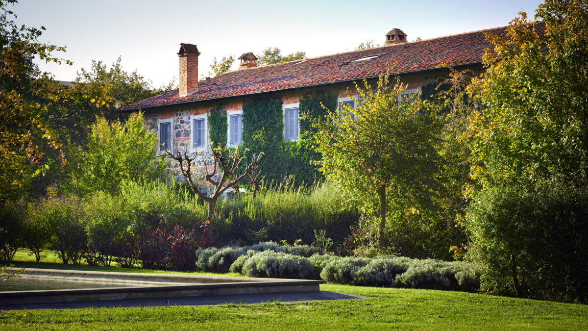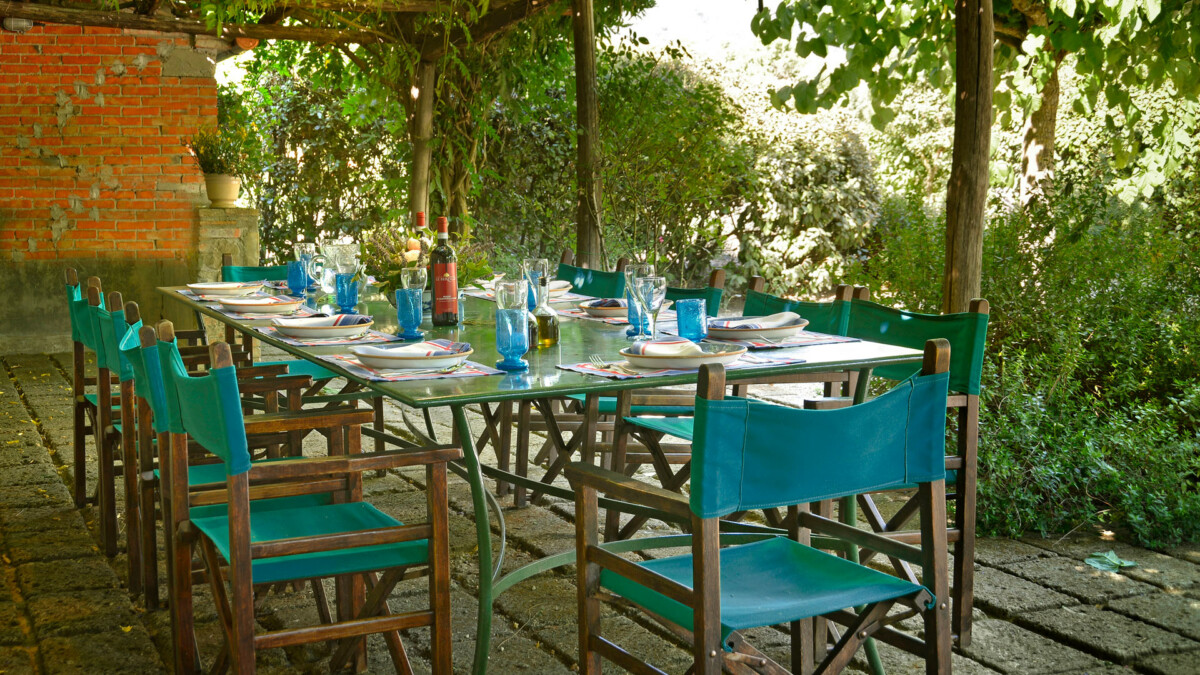 On one side of the house lies the pool house, which also contains a garden kitchen for outdoor meals. A pergola covered in vines and wisteria provides shade over a large table.