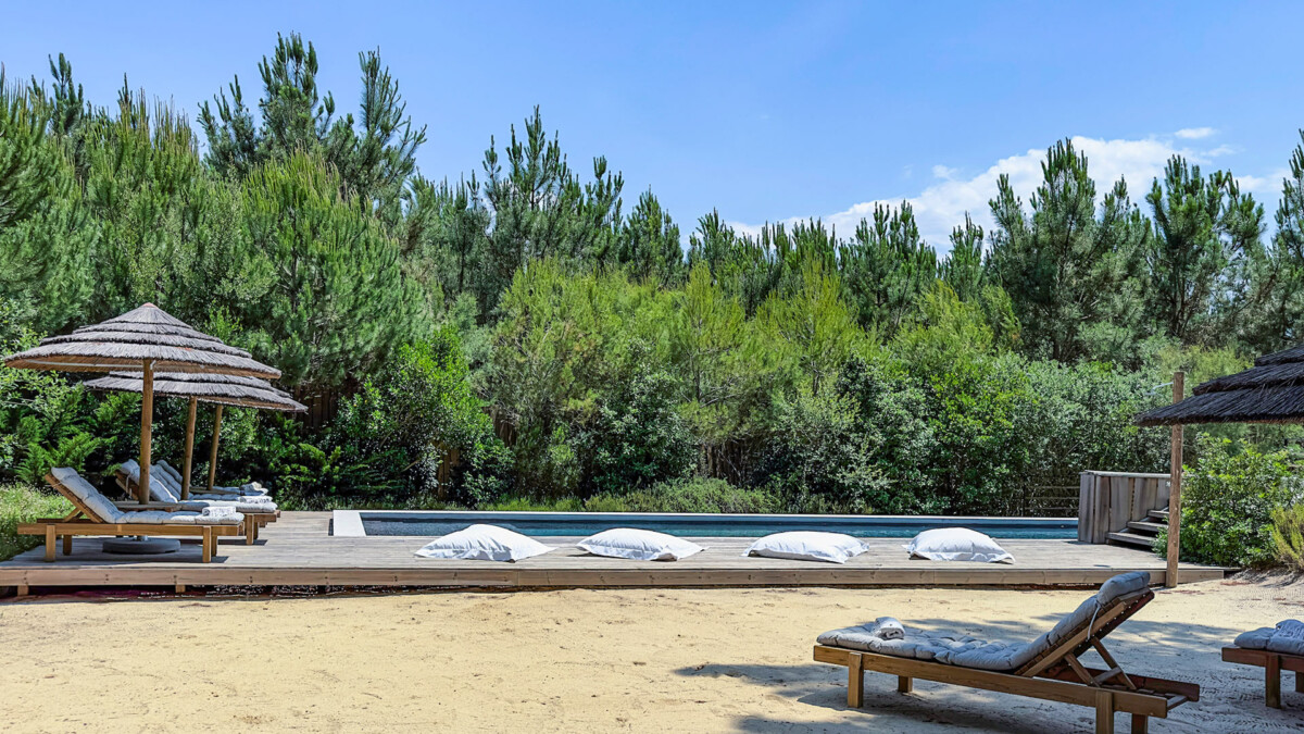 Les extérieurs, qui s’étendent sur un vaste terrain de 5000 m², sont un véritable havre de paix. Les terrasses en bois, le jardin en sable et la magnifique pinède créent un cadre enchanteur pour se détendre et profiter de la nature environnante.