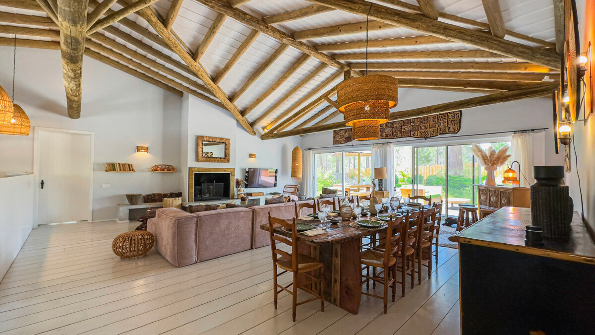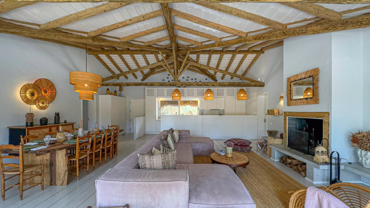 La pièce maîtresse de la maison est sans nul doute le grand salon de 90 m², caractérisé par une majestueuse charpente et une hauteur sous plafond impressionnante. Cet espace de vie est baigné de lumière naturelle et s’ouvre sur deux terrasses spacieuses, offrant ainsi un lien harmonieux entre l’intérieur et l’extérieur. La décoration est typiquement locale, mêlant matériaux naturels et éléments contemporains pour créer une atmosphère à la fois chaleureuse et élégante.