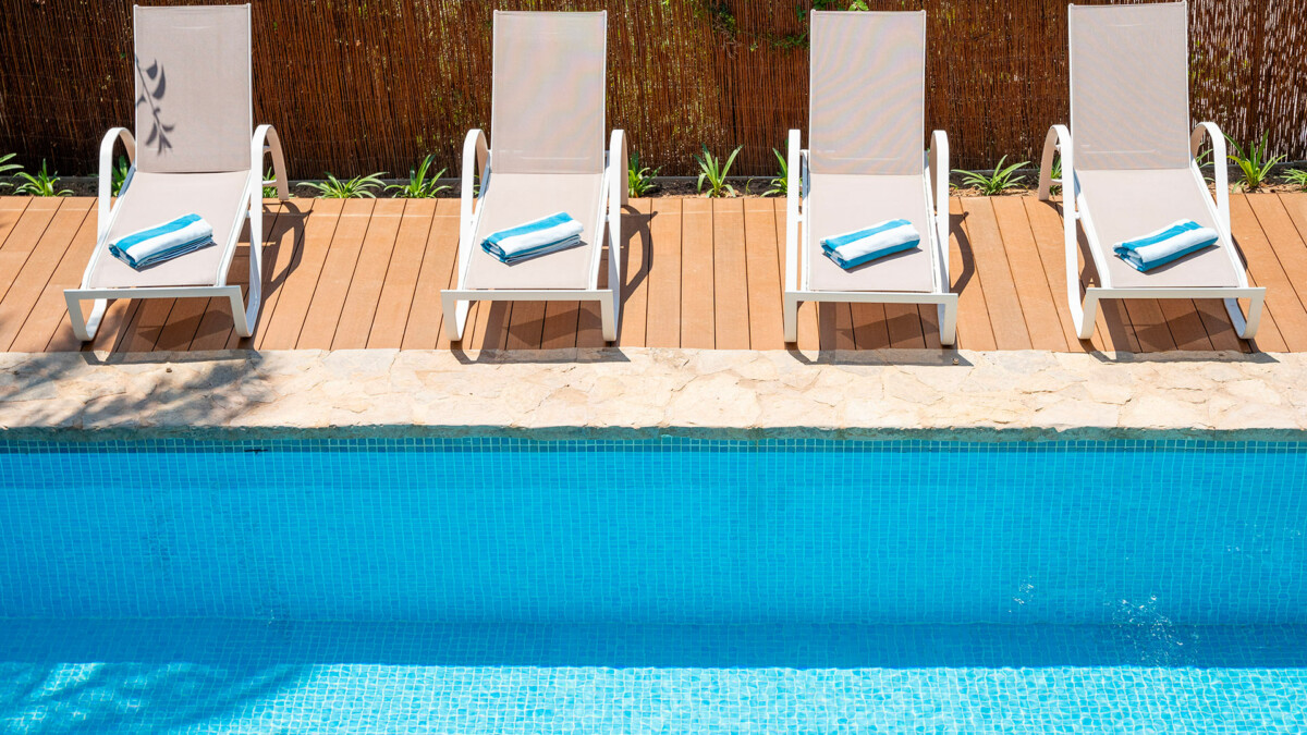 Au rez-de-chaussée se situe le jardin méditerranéen luxuriant, la piscine et un solarium avec plusieurs chaises longues.