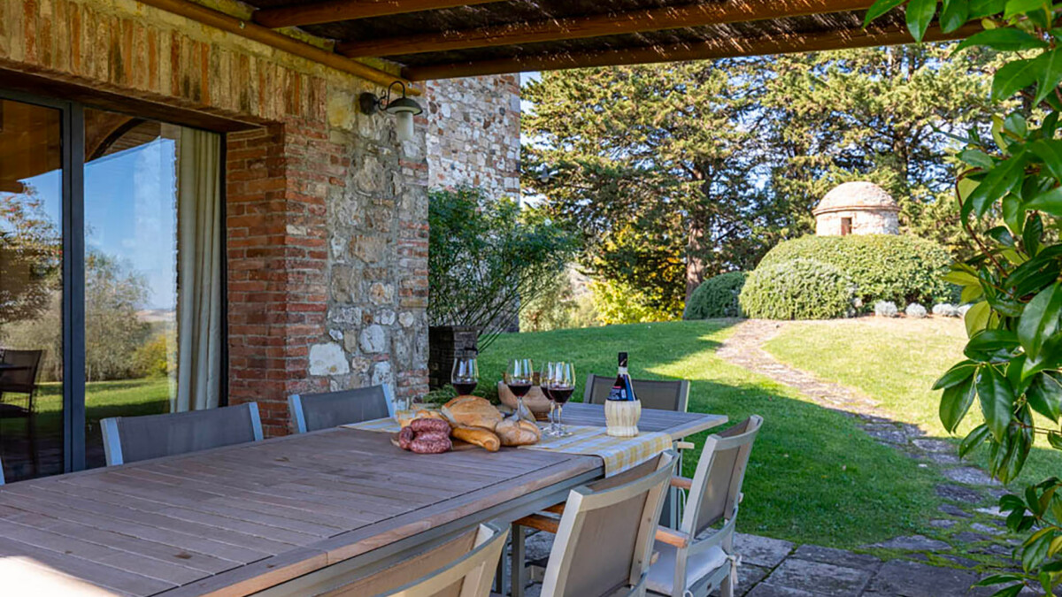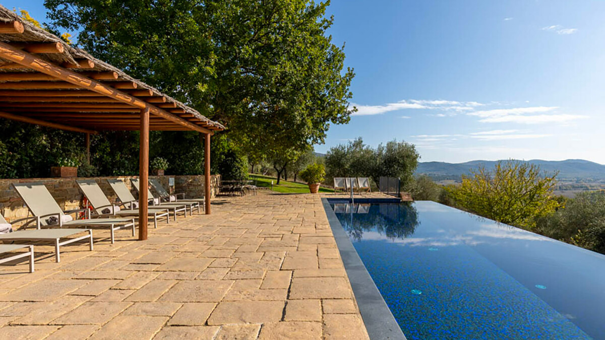 The property benefits from a stone courtyard where you can relax and enjoy al fresco dining while admiring the Tuscan landscape. The mosaic-tiled infinity pool is a haven for cooling off while taking in the breathtaking views of the surrounding hills.