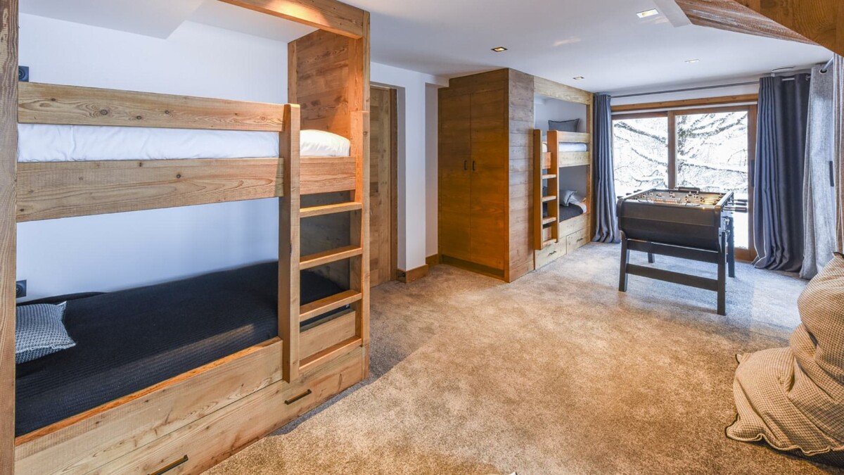 Chambre d’enfant, Rez-de-chaussée. La chambre propose 4 lits superposés. Salle de bain attenante, avec douche. WC dans la salle de bain. La chambre inclut également : TV, coffre fort, terrasse privée.