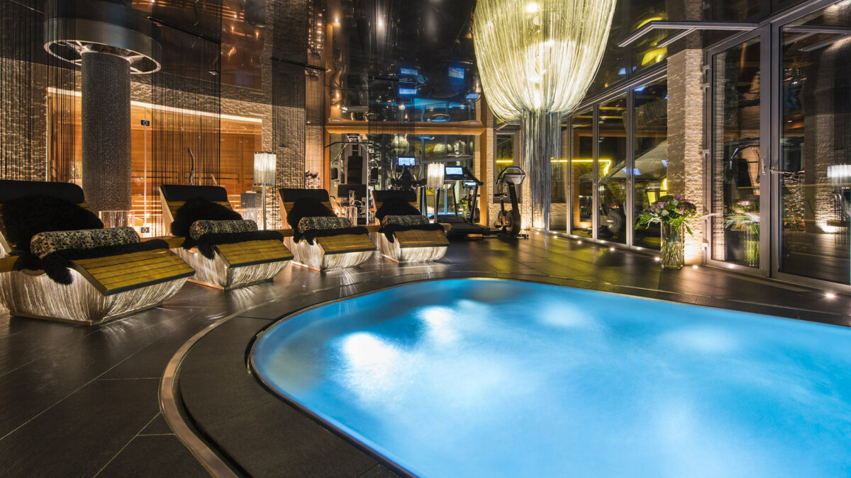Les visiteurs apprécieront l’espace ouvert, le sol en pierre naturelle d’origine locale, le mur en bambou associé à des éléments en bouleau argenté, la cascade du Cervin sculptée à la main par un designer, l’escalier flottant en bois de Nussbaum (noyer) (avec verre design) et l’ascenseur (avec sol en pierre de granit, bois et panneaux recouverts de miroirs qui permettent d’accéder à tous les niveaux). L’accès à la mezzanine se fait par l’escalier en colimaçon en bois et en acier inoxydable.