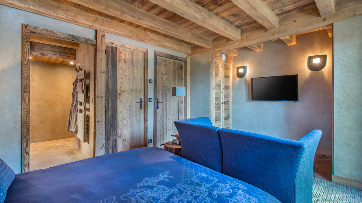 – Chambre en suite master N°5 de 30 m², lit de 200×180 séparable en deux lits simples (200×90), coin bureau, salle de bain (baignoire avec splendide vue au Sud), terrasse privée au sud avec splendides vues , TV écran plat, WC séparé