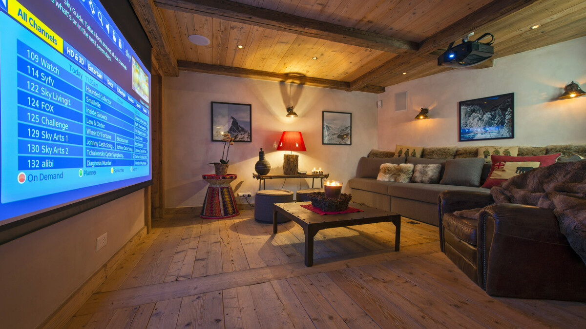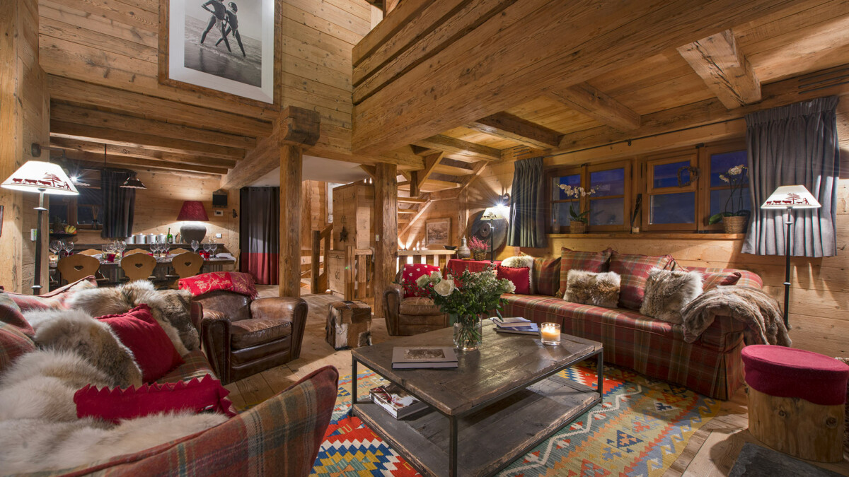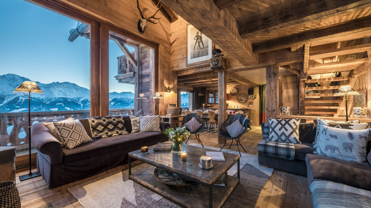 Le chalet est le comble du chic alpin avec des canapés en cuir et des finitions en bois ancien au style alpin.