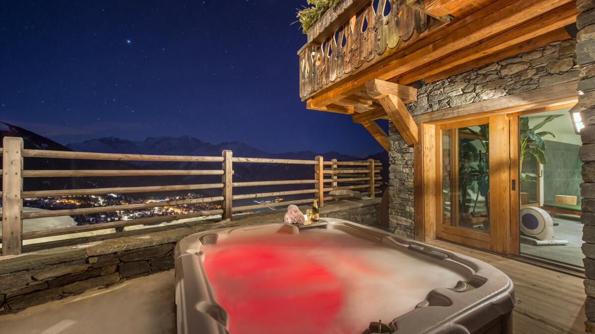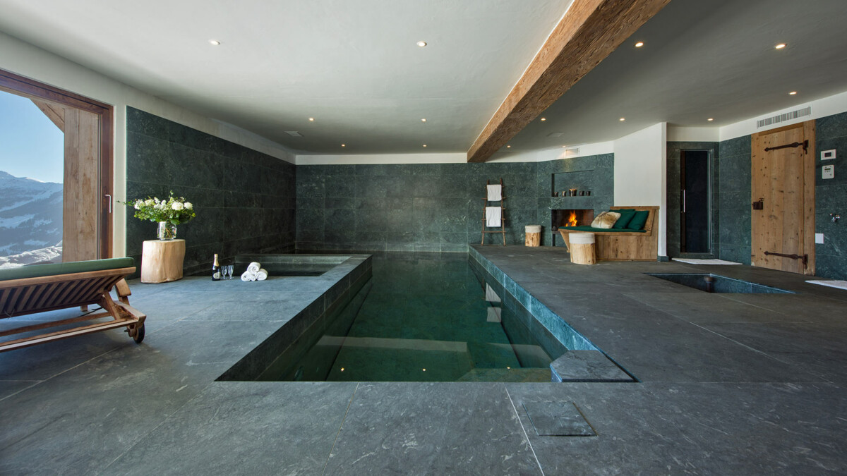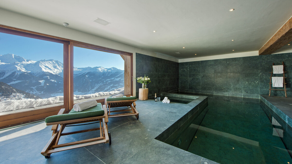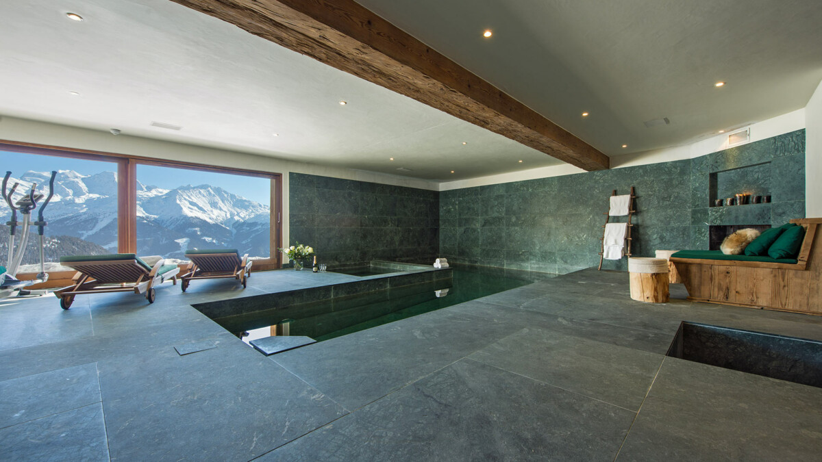 Le chalet est aménagé sur 4 étages et peut accueillir jusqu’à 14 personnes (10 adultes et 4 à 6 enfants). Le logement est divisé en deux structures distinctes : un chalet principal et un Mazot (refuge typique de montagne). Le chalet dispose également d’un vaste spa privé tout de marbre italien avec vue sur la vallée et les montagnes au loin.
