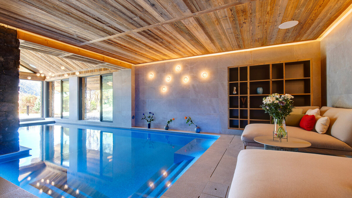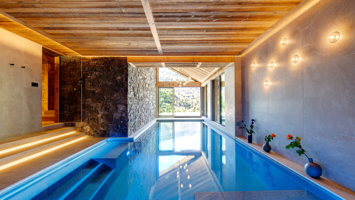 L’étage inférieur abrite quatre chambres qui bénéficient d’accès directs aux terrasses ou au jardin, une buanderie, mais surtout une magnifique piscine intérieure privée. Celle-ci dispose d’un système de nage à contre-courant, ce qui vous permettra de vous entrainer tout en admirant la vue sur la vallée. Une porte avec un code permet de d’empêcher les enfants d’accèder à la piscine. De plus, une alarme en cas de chute dans l’eau peut être activée. Un petit salon et un système sonore font de cet endroit, un lieu propice à la détente.