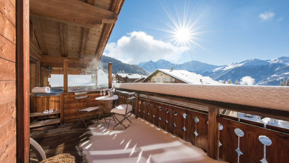 Le soleil vous inondera de sa lumière du sol au plafond à travers les baies vitrées qui s’ouvrent sur un grand balcon orienté Sud dominant toute la vallée. Sur le balcon, relaxez-vous sur les chaises recouvertes d’une tendre peau de mouton ou dégustez un verre de champagne dans le jacuzzi extérieur privé.