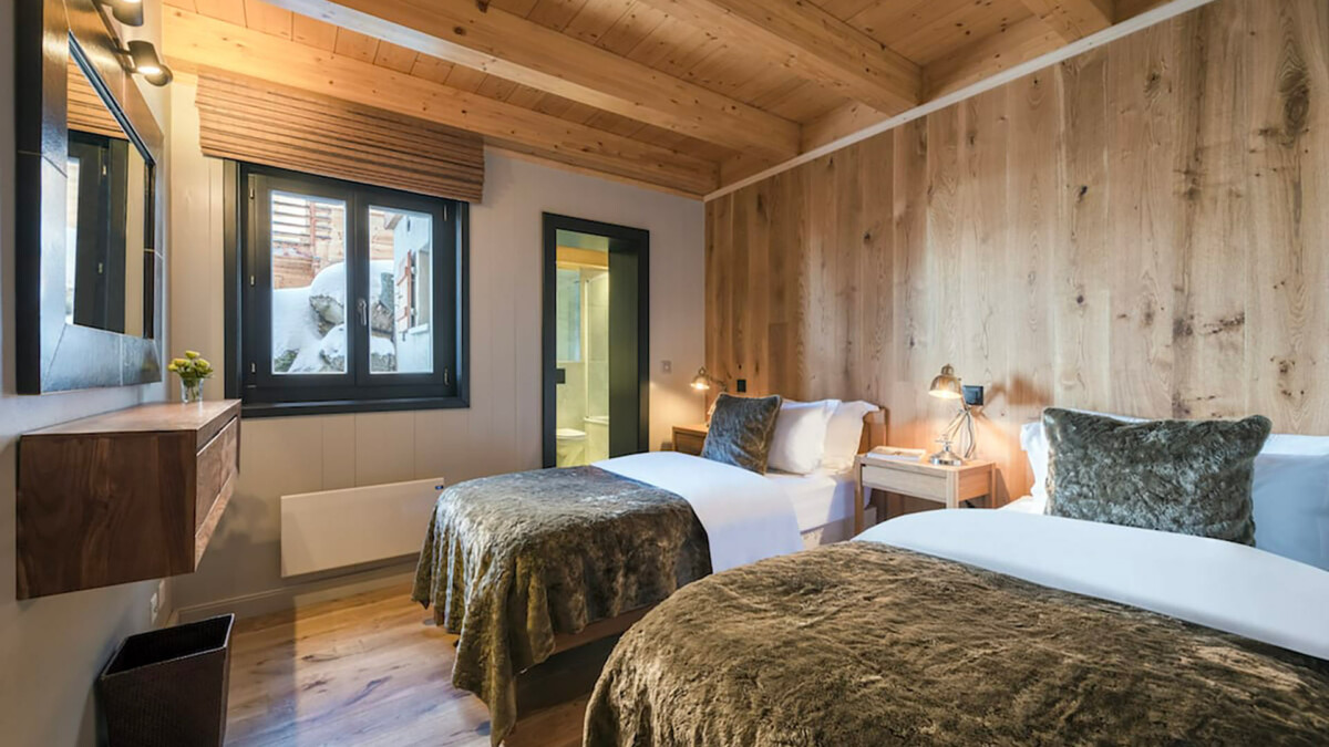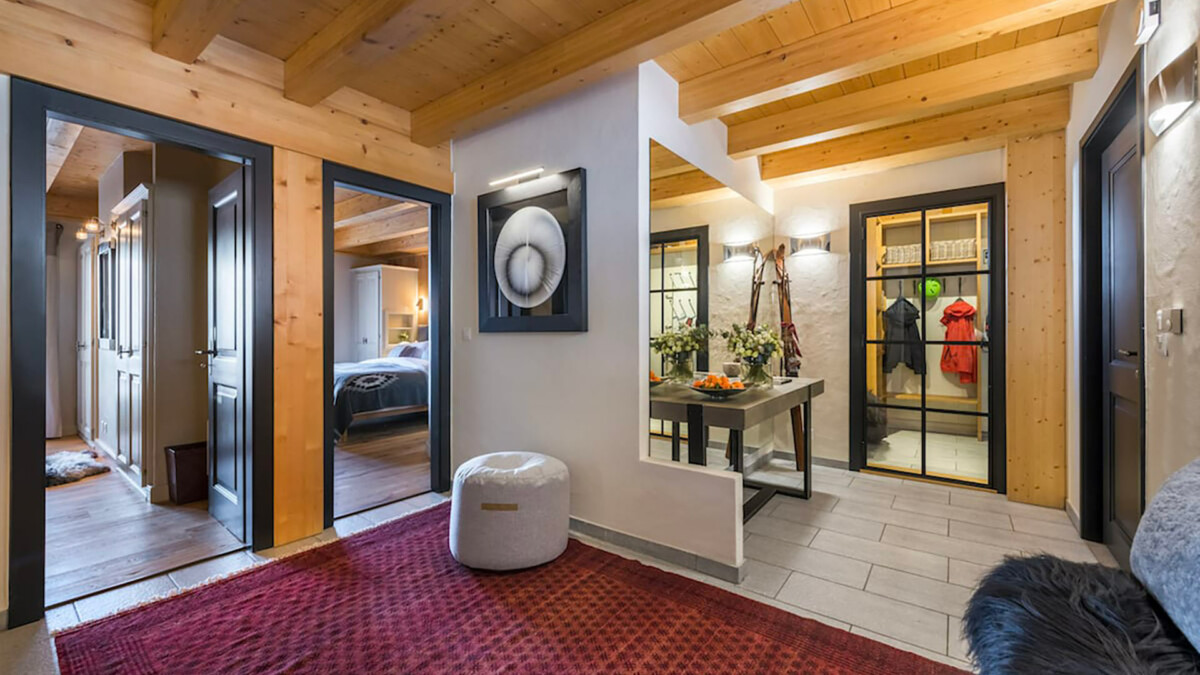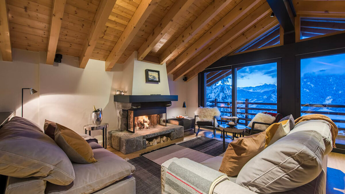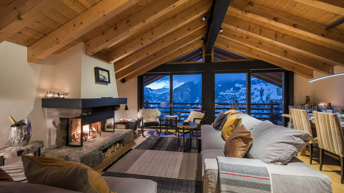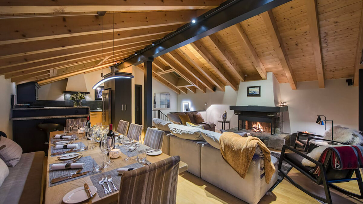 Le chalet propose une ambiance chaleureuse répartie sur cinq étages. Dès l’entrée, un grand hall mène aux chambres principales. Un espace de vie ouvert au dernier étage, avec une cheminée en pierre et des canapés confortables, invite à la convivialité. La cuisine ouverte et la salle à manger, avec une table pour dix, sont conçues pour les repas partagés.