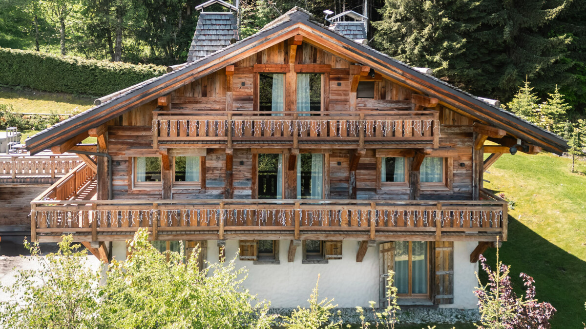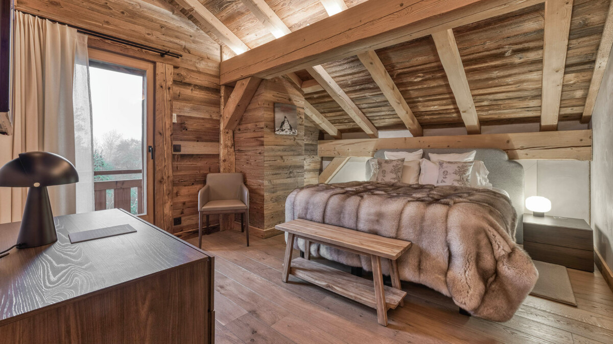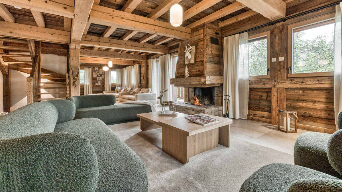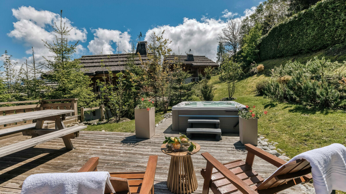 The chalet opens onto a generous terrace with uninterrupted views of the Alps. The wooded grounds surrounding the property add to the sense of tranquillity and privacy.