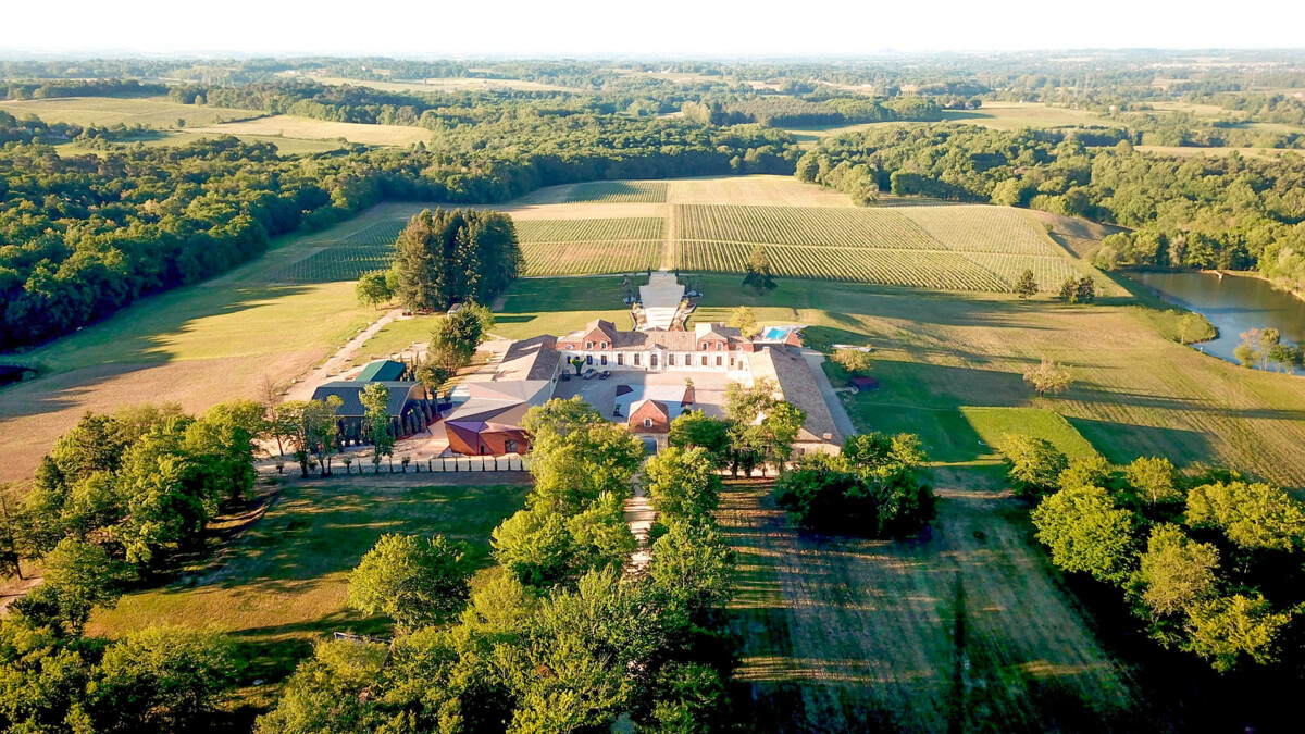 De la grande terrasse du château, le regard embrasse un somptueux paysage de vignes et de forêts. Cette élégante bâtisse en pierres de Bordeaux est composée de quatre corps de bâtiment organisés en carré autour d’une vaste cour d’honneur aujourd’hui gazonnée.