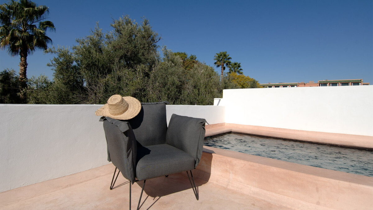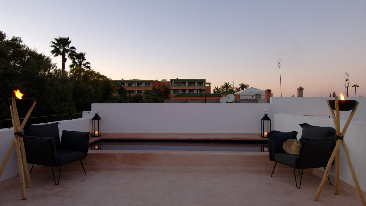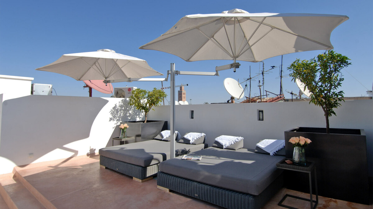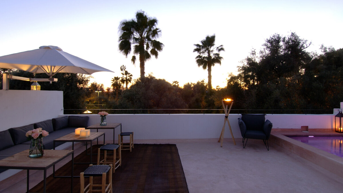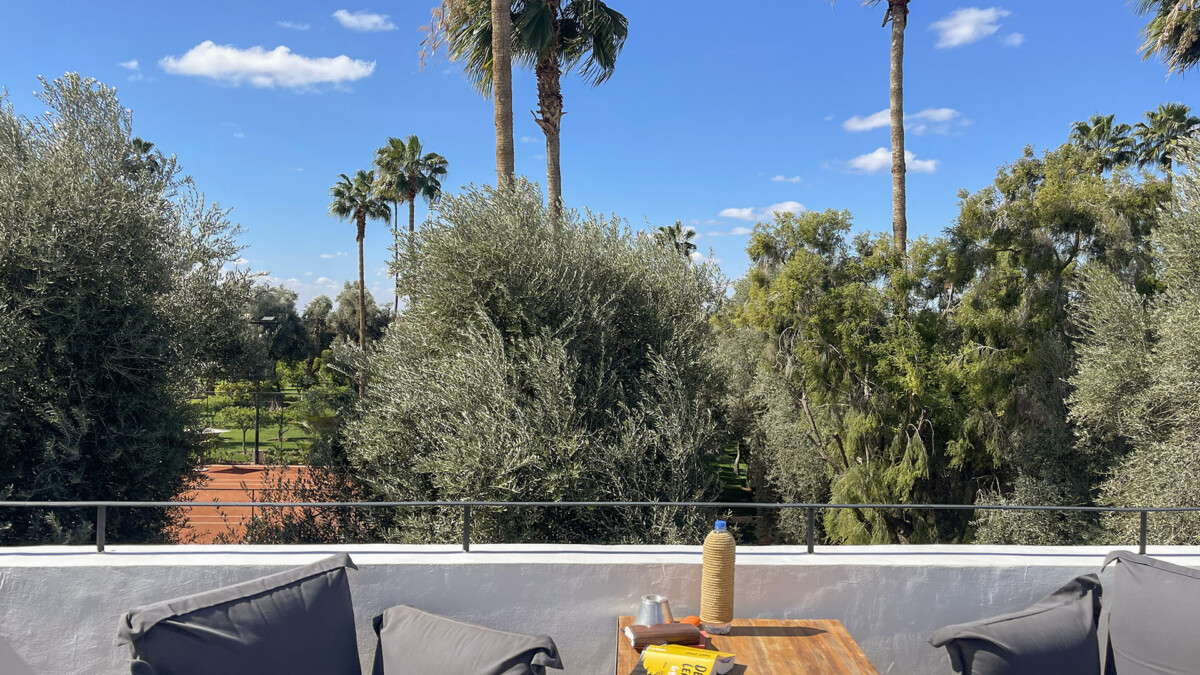 La terrasse sur le toit est équipée de tables et d’un coin lounge avec vue exclusive sur les jardins de la Mamounia, à l’ombre de grands parasols.