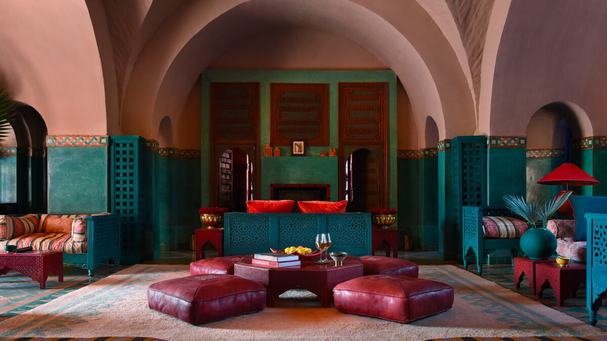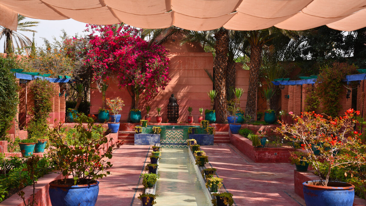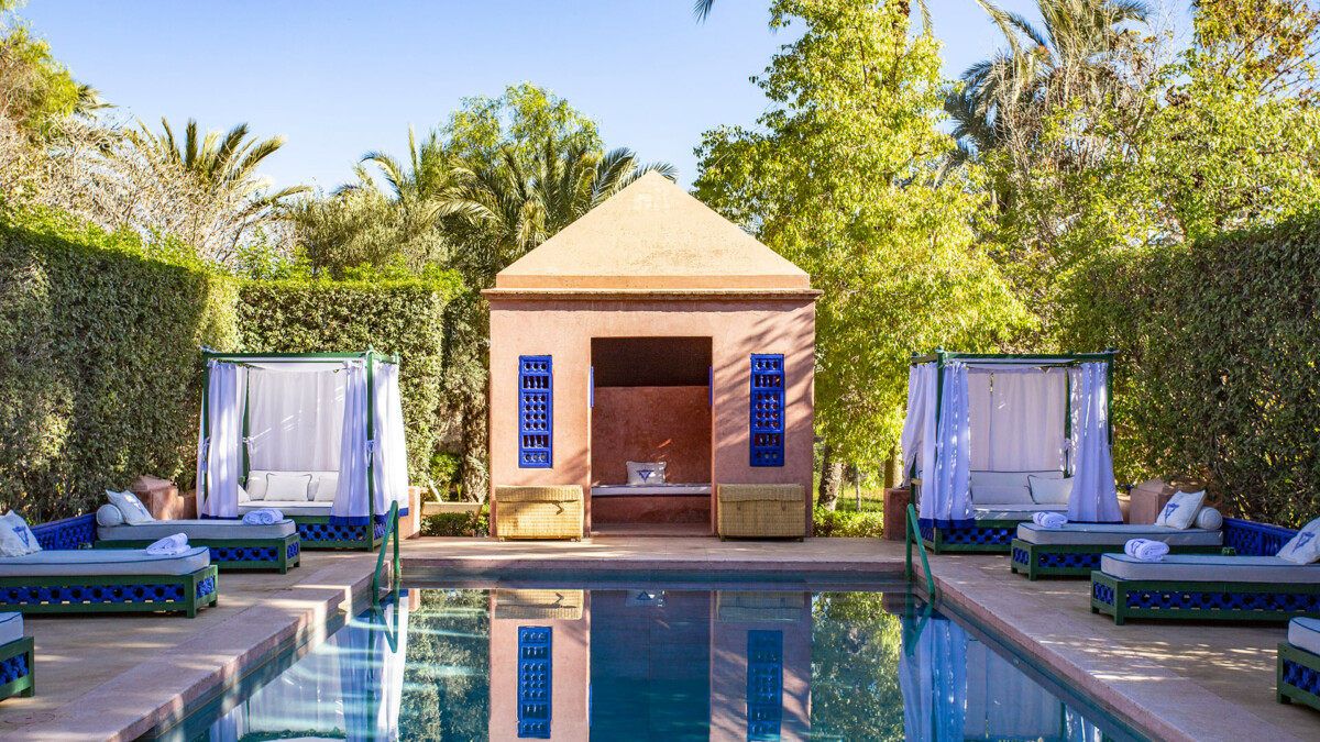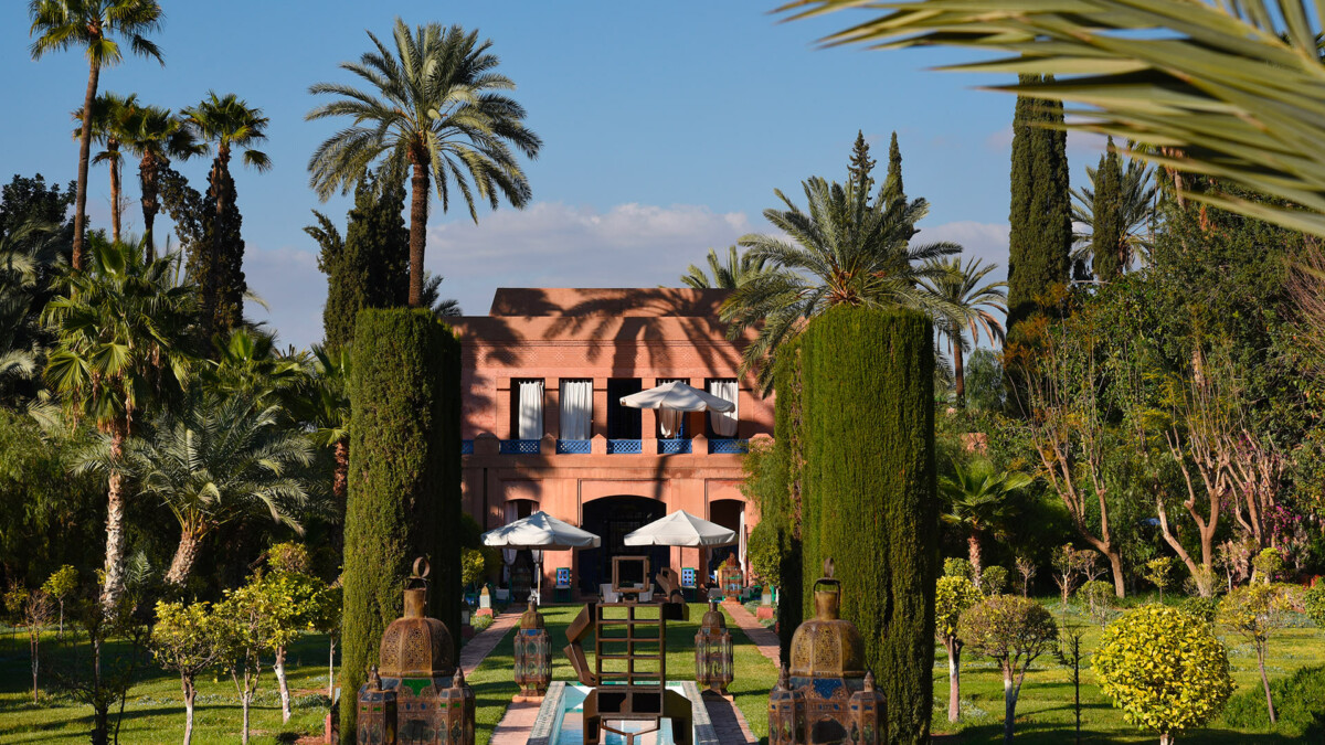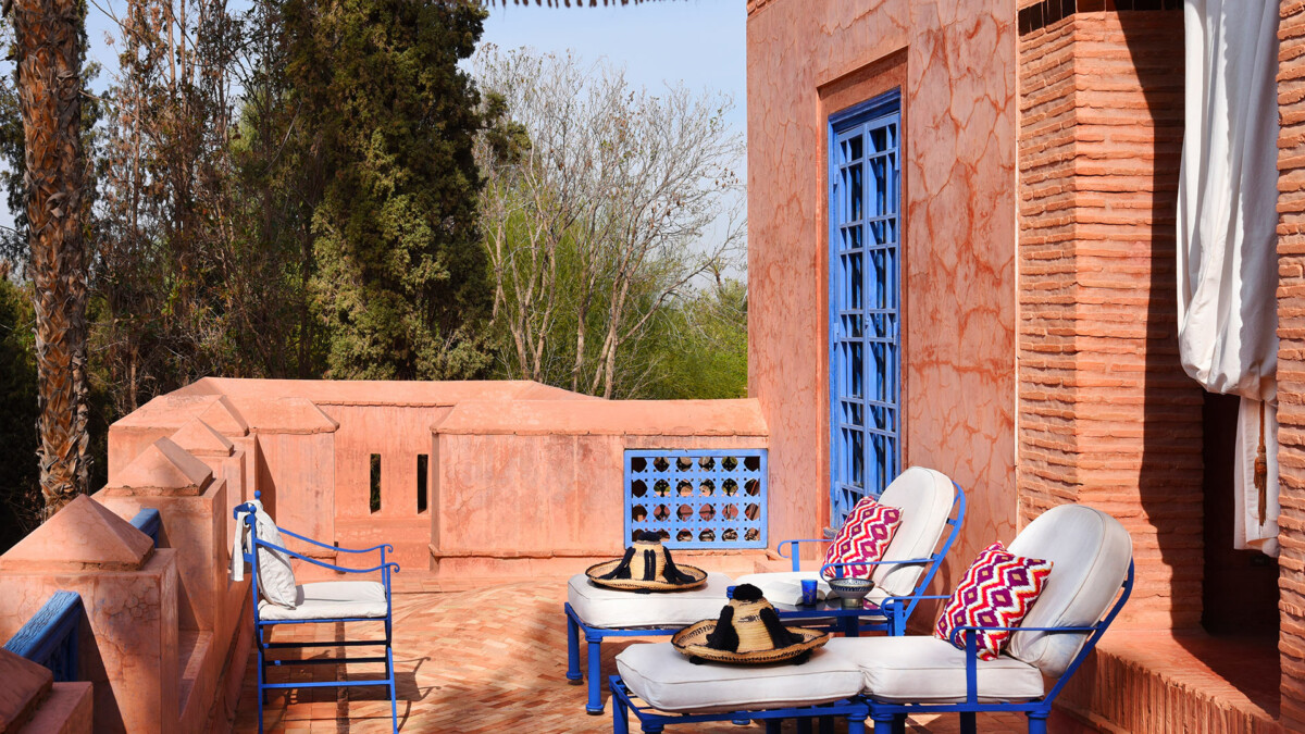 La villa « Dar Abiad » est une magnifique propriété qui se trouve au cœur de la mythique Palmeraie de Marrakech. Cette superbe maison familiale a été construite entièrement en pisé par le célèbre architecte Elie Mouyal et décorée par Jacqueline Foissac. Il s’agit de l’une des premières villas de la Palmeraie. La maison, l’immense jardin privé et ses arbres centenaires, les meubles et les objets de décoration, la présence du personnel, les touches orientales subtiles, tout cet ensemble dégage un charme surrané qui vous transporte dans le Marrakech des années 70 que chacun d’entre nous a fantasmé. On imagine si bien les figures de Yves Saint Laurent déambulant en djellabah bleue sur les terrasses ou Mick Jagger partageant un thé à la menthe avec Marianne Faithfull au bord du bassin au soleil couchant.