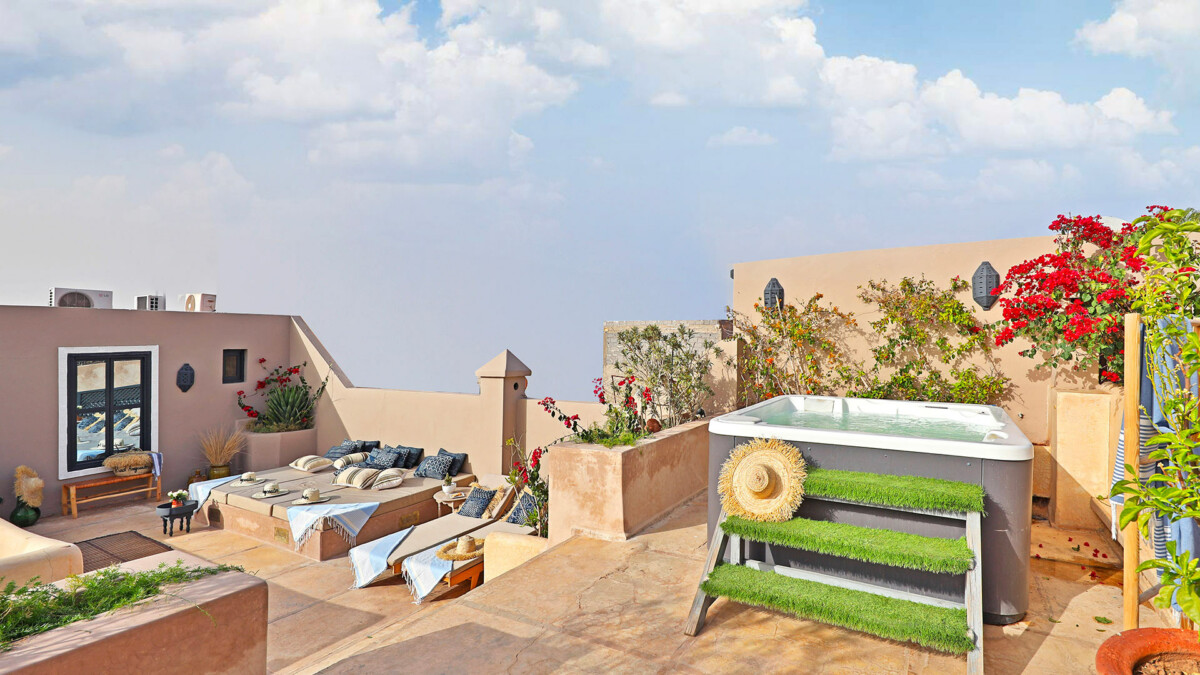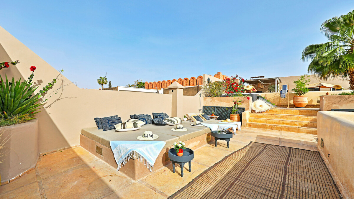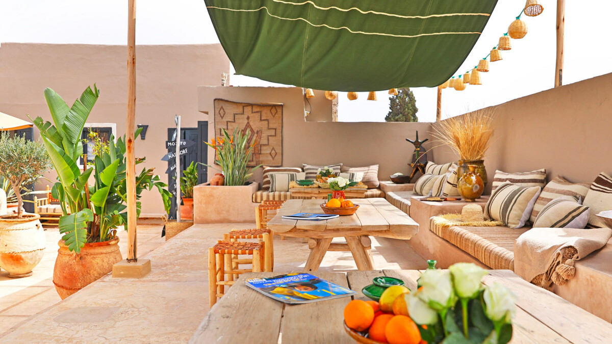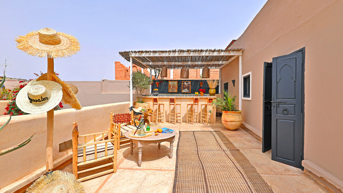 La terrasse offre un espace dégagé et lumineux avec bar, solarium, salon ombragé et espace de restauration, sans oublier une large vue sur l’Atlas.