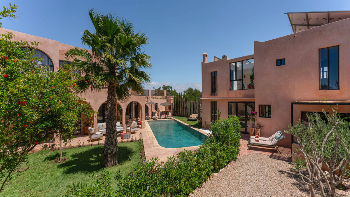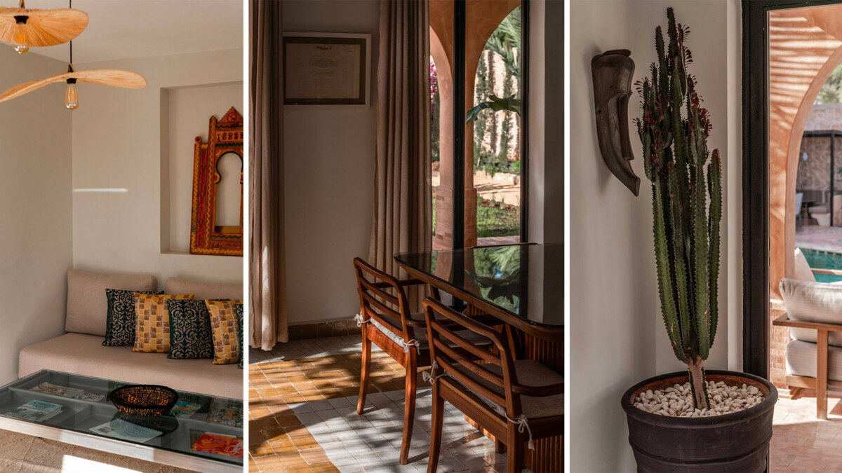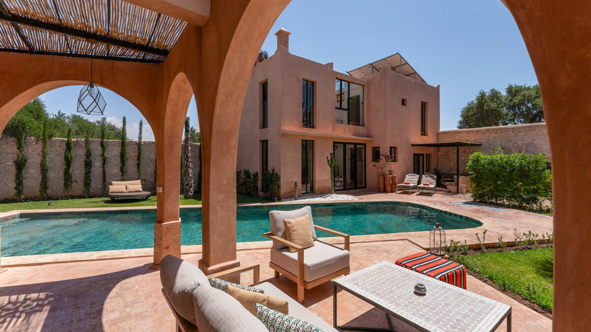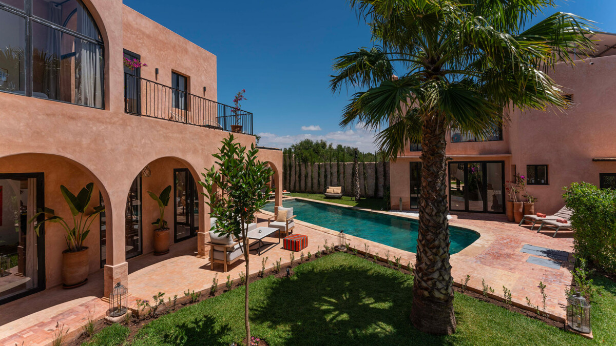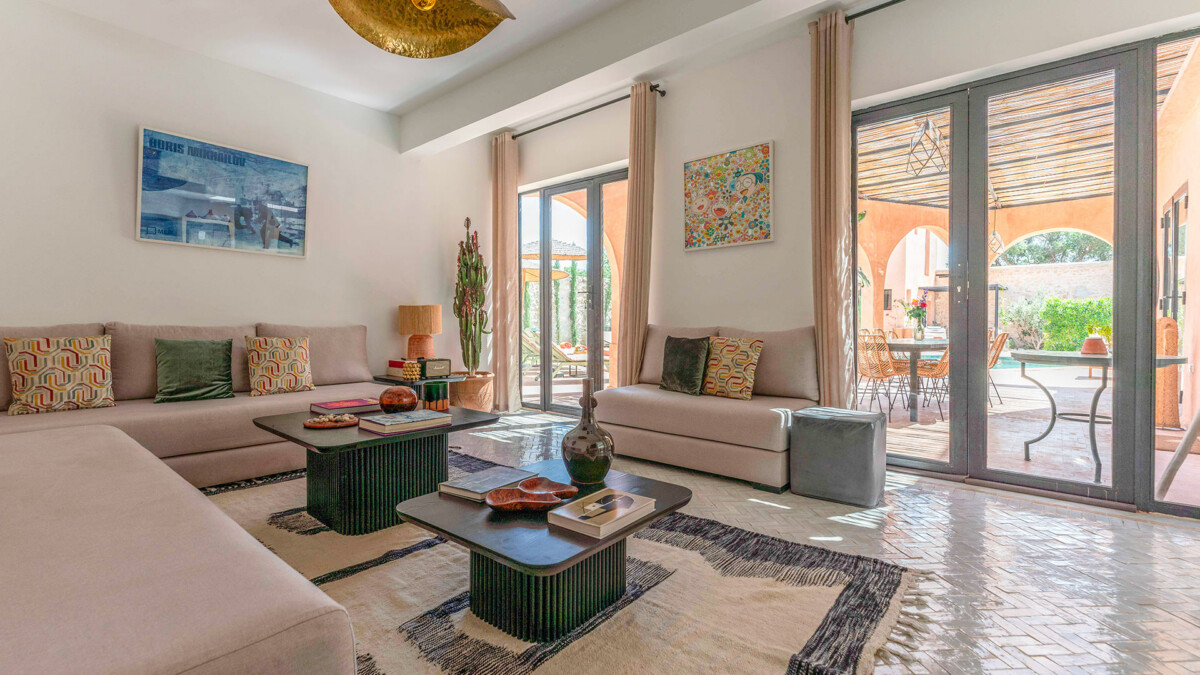 Les intérieurs de la villa sont à l’image du style marocain contemporain, avec des éléments traditionnels soigneusement intégrés dans une décoration moderne et raffinée.